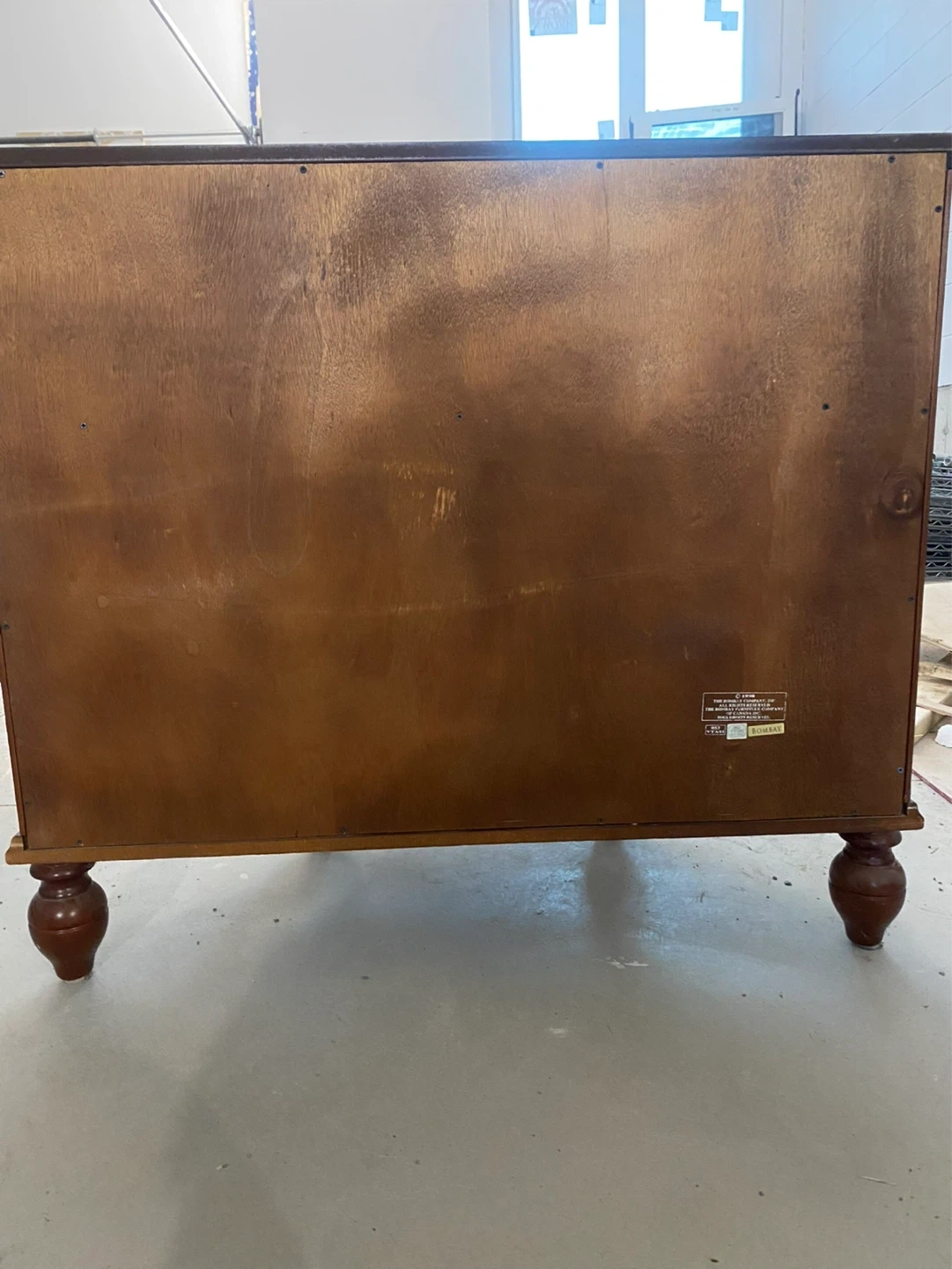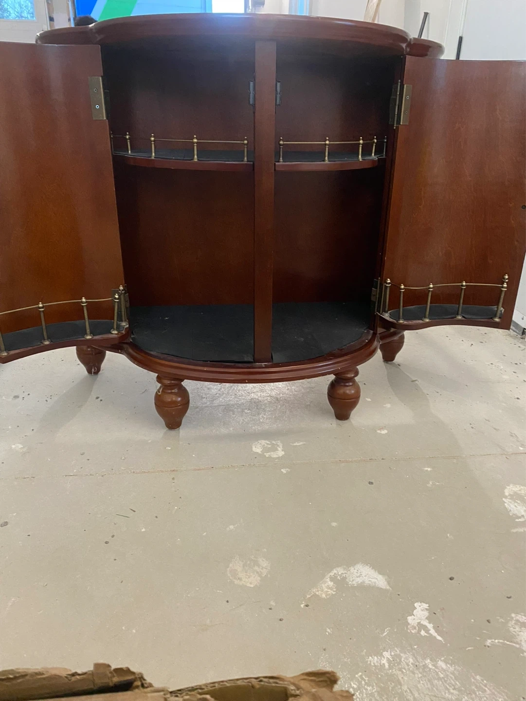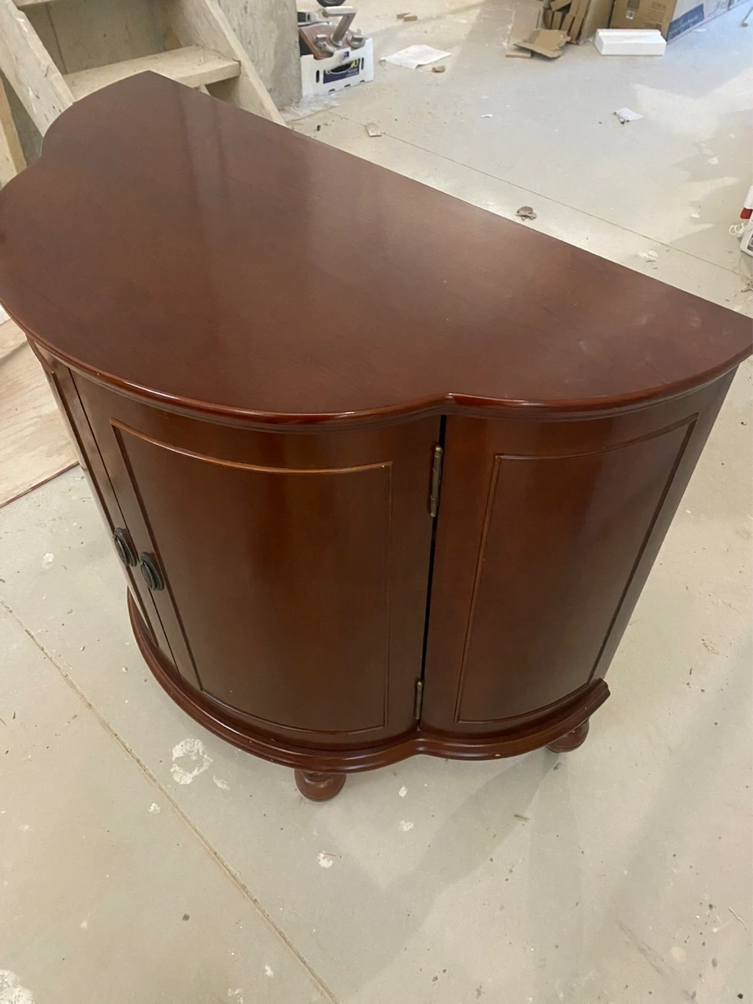 Beautiful solid wood liquor cabinet with a rich cherry finish, perfect for adding a touch of sophistication to any space. This unique piece features a curved front design and classic detailing