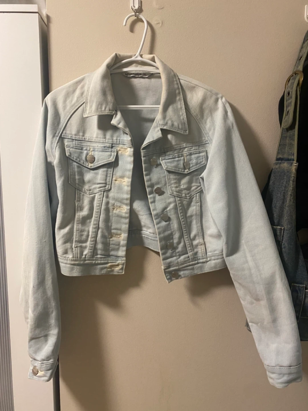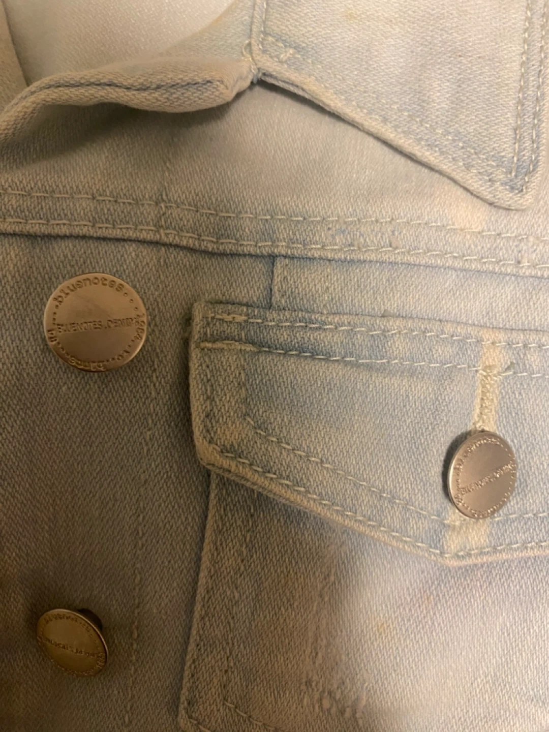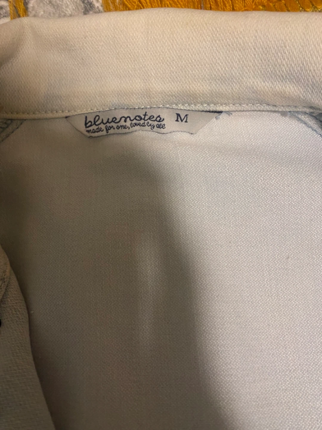 Blue Notes denim jacket in a light wash. It's a size medium with button closures and chest pockets. This classic jacket is a versatile addition to any wardrobe!
