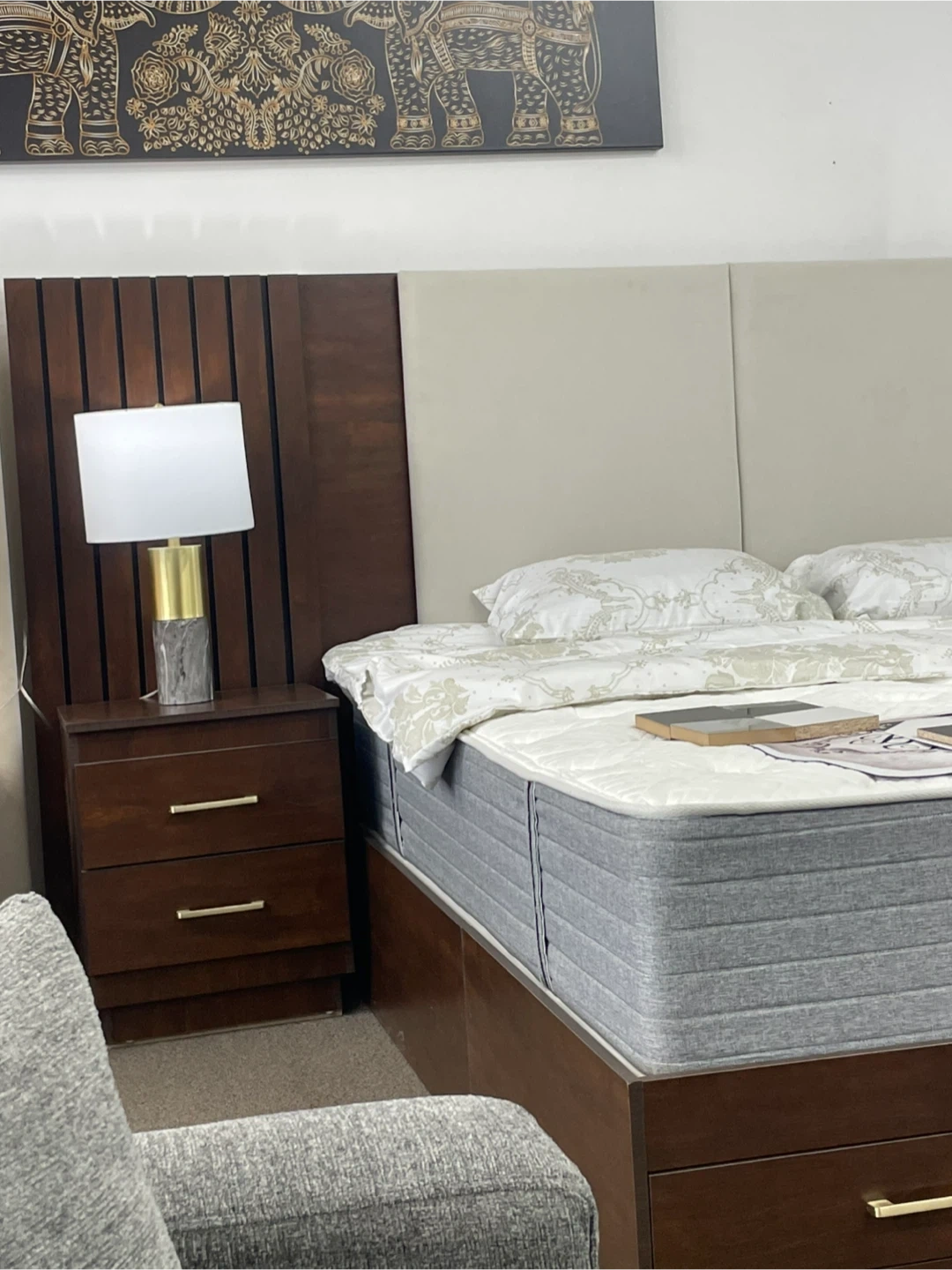 Comfortable queen size mattress featuring a grey quilted top. Comes with a dark wood bed frame that includes built-in storage drawers at the foot of the bed. Perfect for maximizing bedroom space!