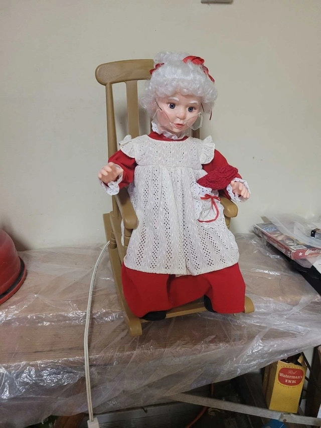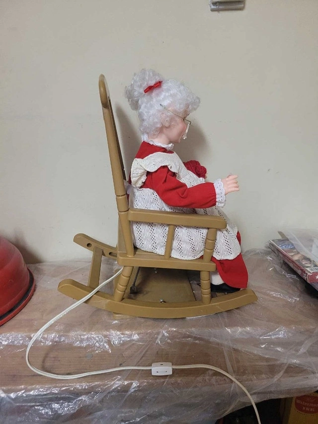 VTG Christmas Santas Best Animated Mrs Claus Holiday Rocking Chair in excellent Working condition. Her glasses are broken but can easily be glued back or can remove them she is 18" high works on 120v wall plug. Asking $25 pick up on beaverbrook lane Kanata thank you