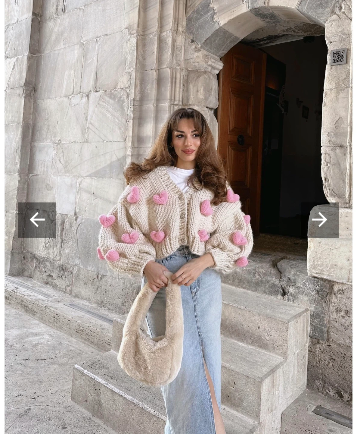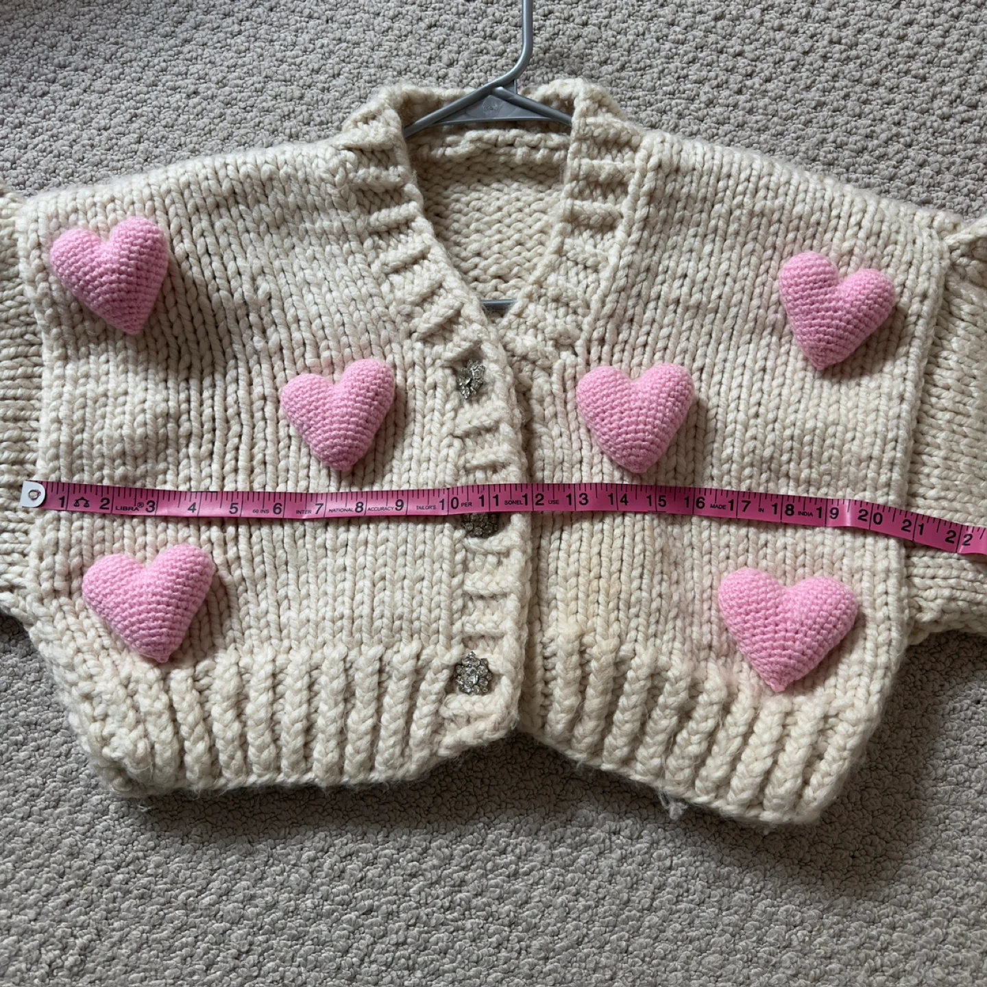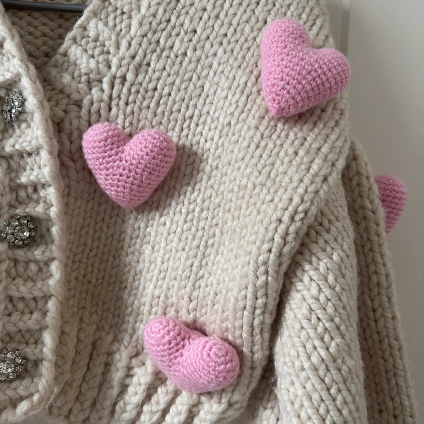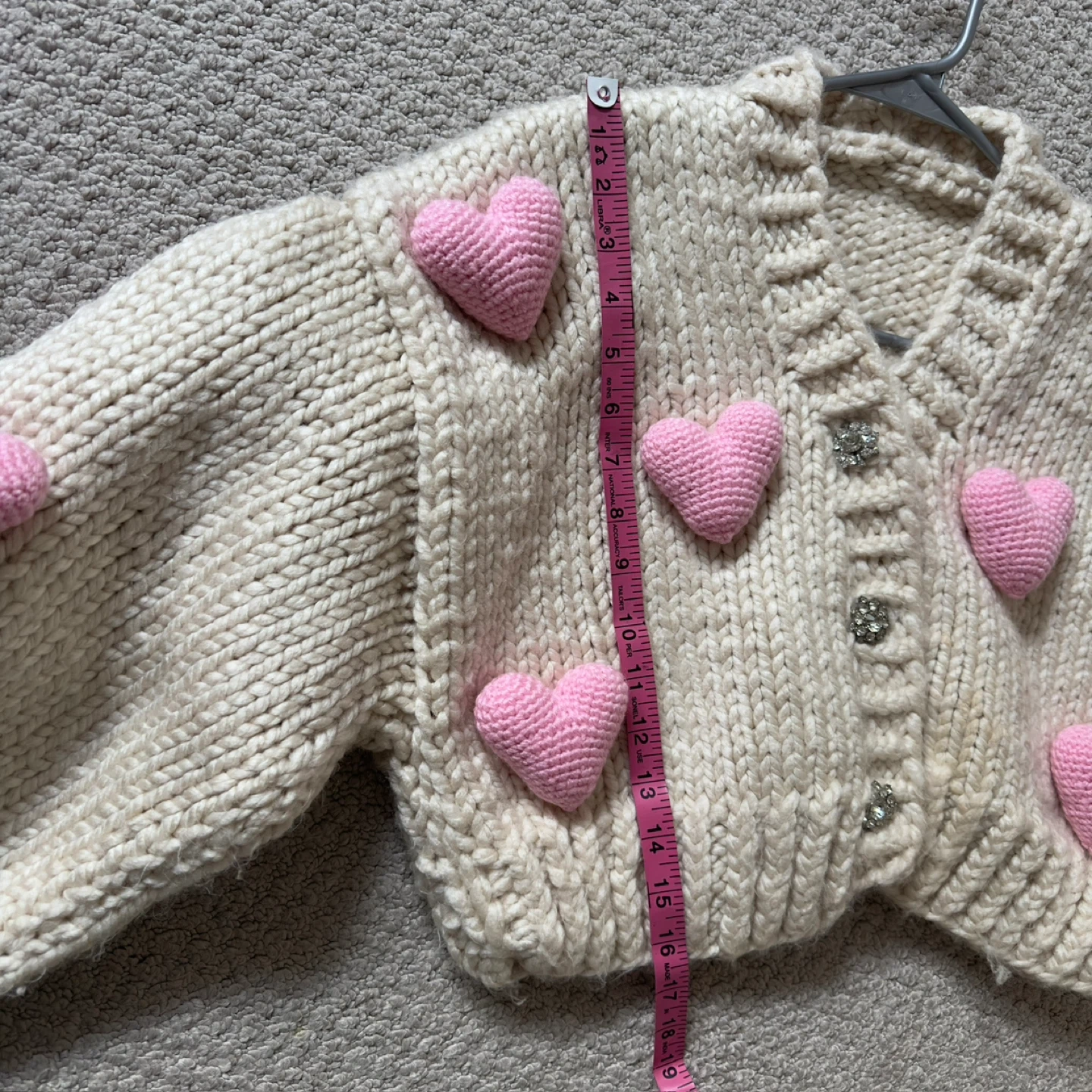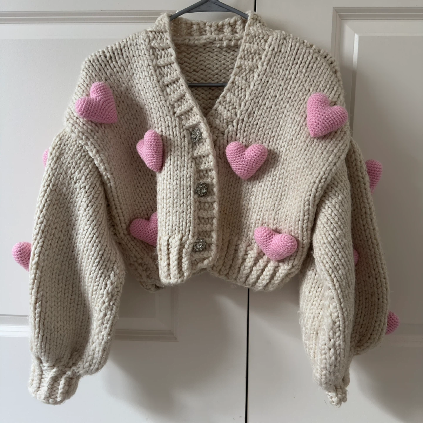 Cream knit cardigan featuring playful pink crochet hearts all over. It has balloon sleeves and diamanté button closures. This cozy piece adds a unique touch to any outfit!