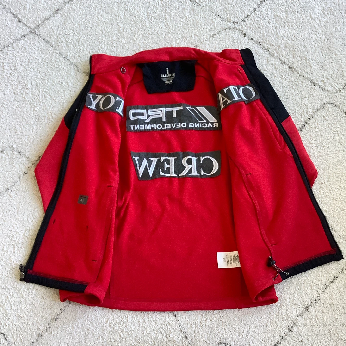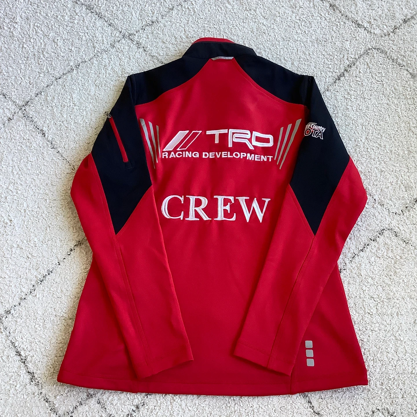TRD Racing Development jacket features "TRD Racing Development" and "CREW" embroidered on the back. It also has "TOYOTA" across the front. It's a great jacket for any Toyota enthusiast! Issued for the team crew.