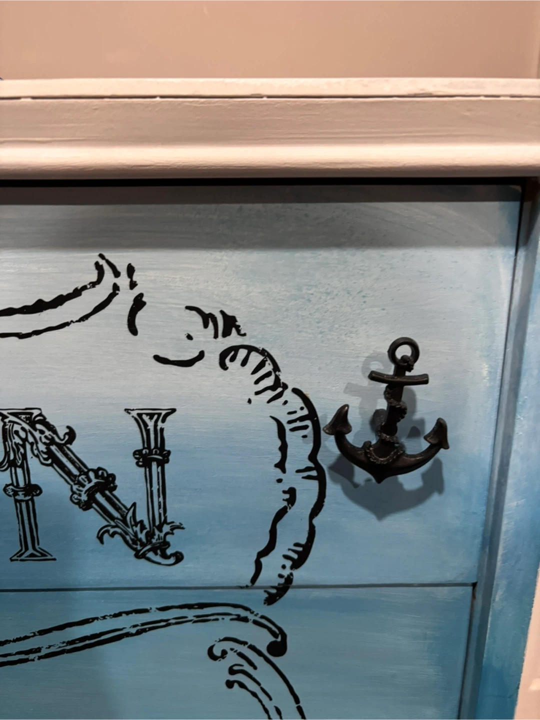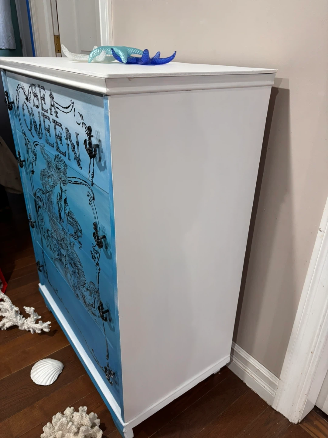🏆This dresser features a 'Sea Queen' design with a mermaid graphic and anchor accents. It's a beautiful piece for a coastal-themed room. The dresser has multiple drawers for storage.