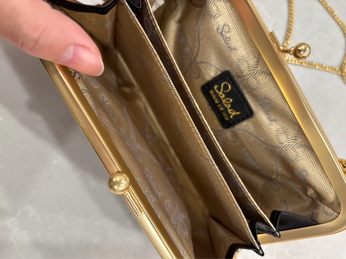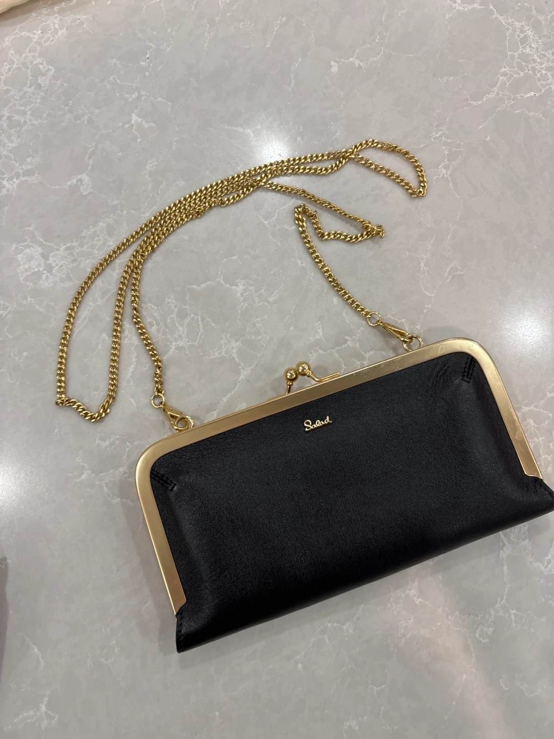 This is a black leather clutch by Salad with a gold chain strap. It's got a classic frame closure and a satin-lined interior with multiple compartments. Perfect for a night out!