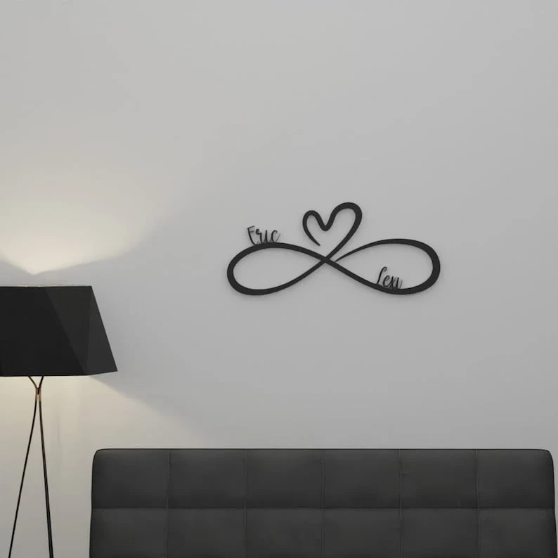 Custom infinity love sign featuring a heart and two names. It's a lovely piece for any home decor! Made of biodegradable plastic. Around 9-10 inches.