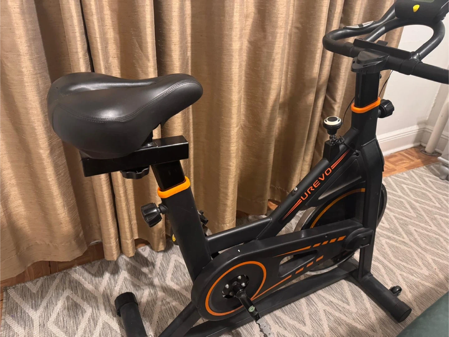 Selling a UREVO exercise bike in good condition. It's perfect for getting a workout in at home. The bike is black with orange accents. Feel free to ask any questions!