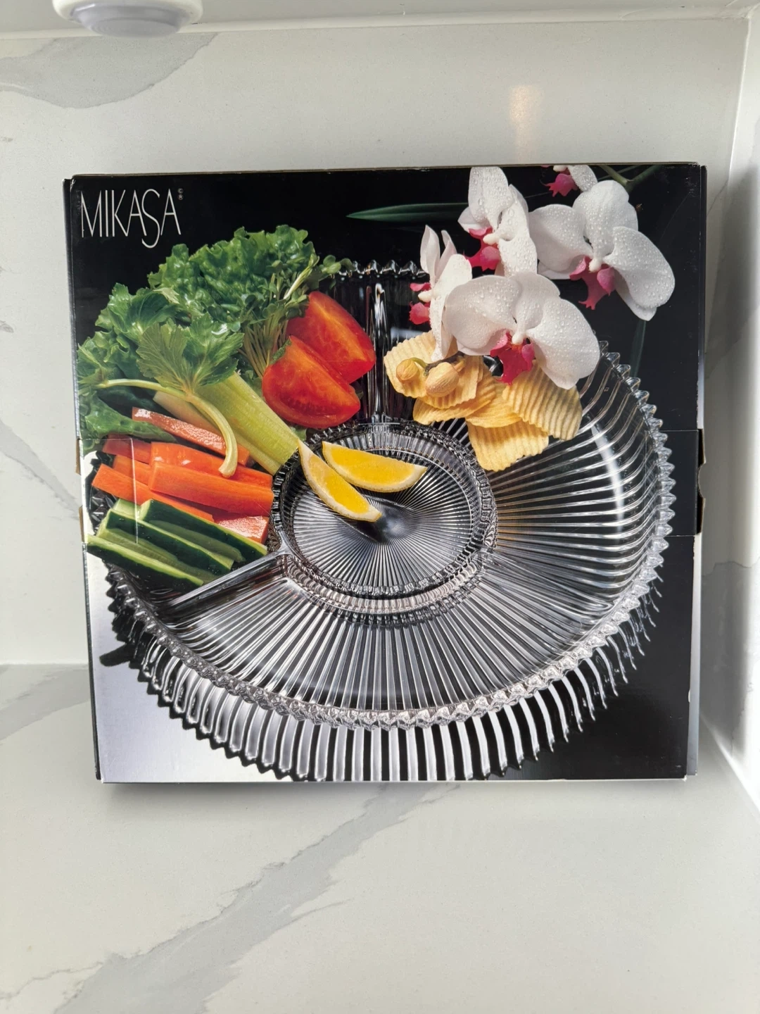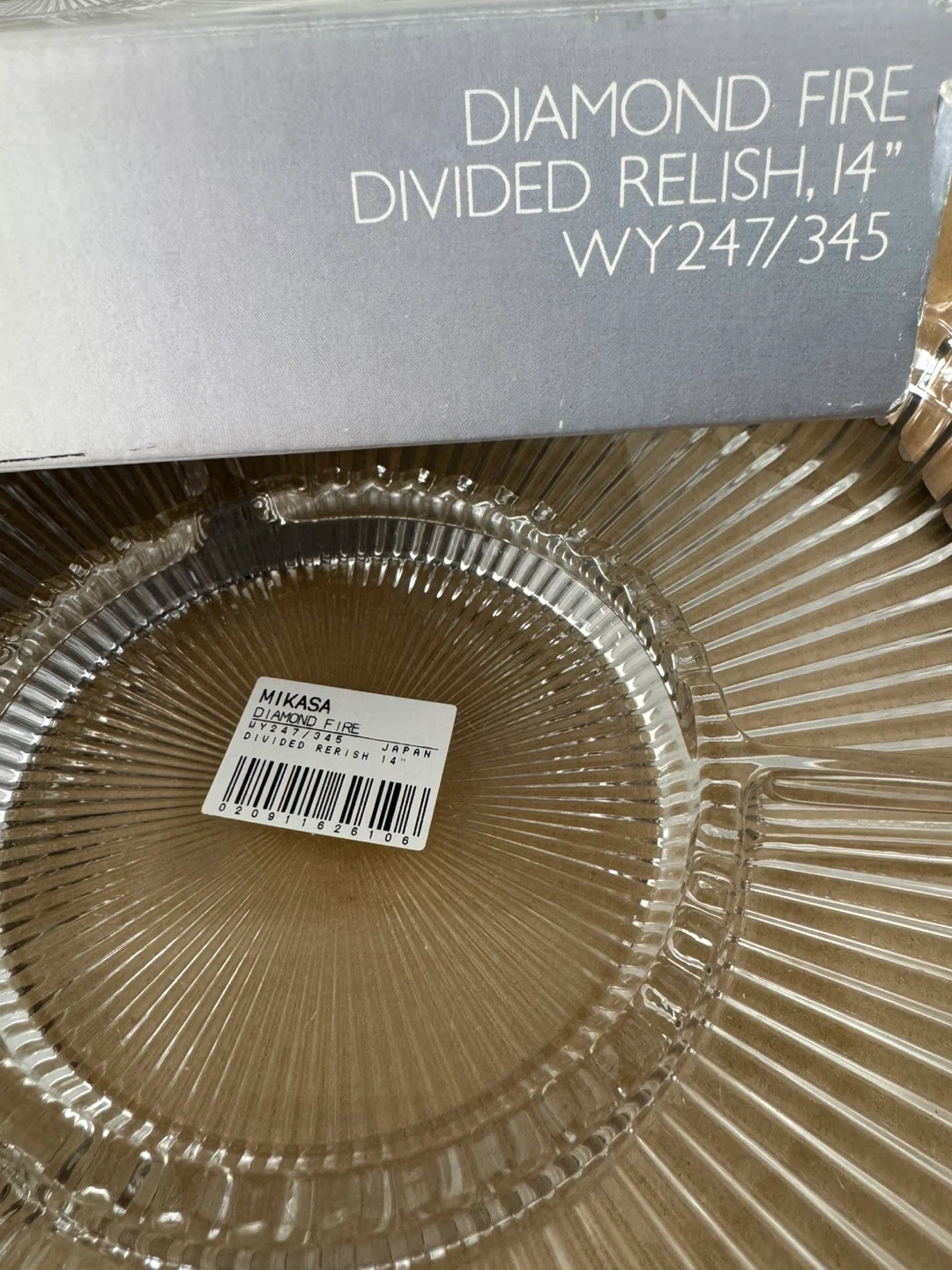 Mikasa Diamond Fire divided relish tray, 14 inches in diameter. Clear glass construction with a fluted design. Includes original box.