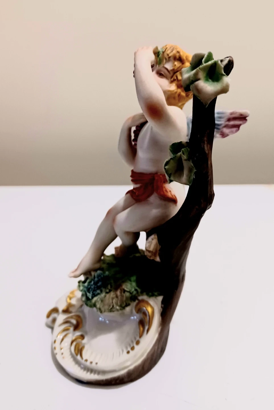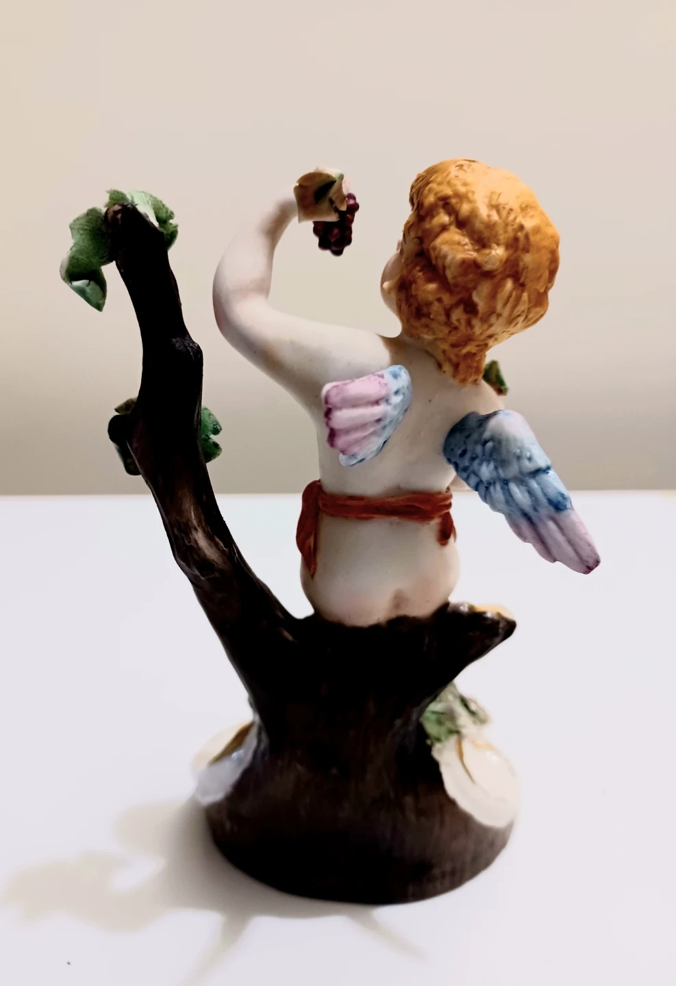 The figurine depicts an angel seated on a tree while eating grapes. This antique item is still in an Excellent condition