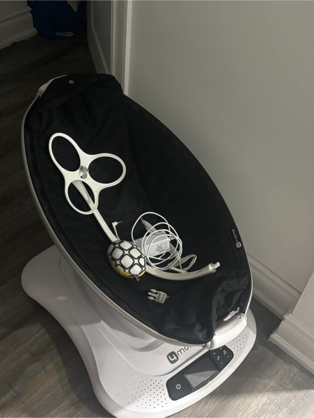 This 4moms MamaRoo baby swing is in black. It includes the mobile and power cord. It's designed for soothing babies with its various motion options. This is a great item for parents looking for a smart way to entertain their little ones.