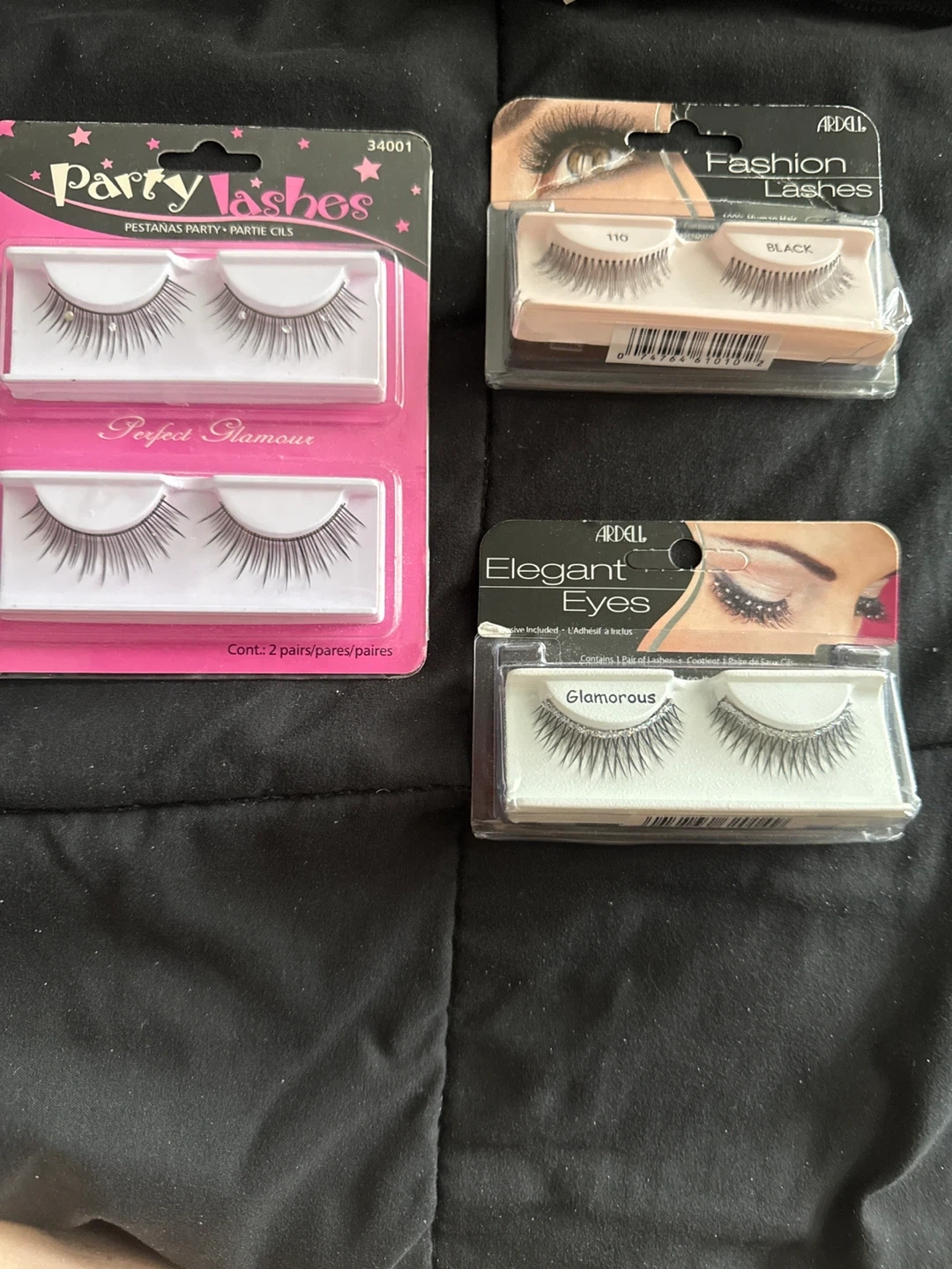 This listing includes two pairs of Party Lashes, one with rhinestones and one without. It also features Ardell Fashion Lashes style 110 (Black) and Ardell Elegant Eyes Glamorous lashes, each containing one pair. These are artificial lashes for enhancing eye appearance.