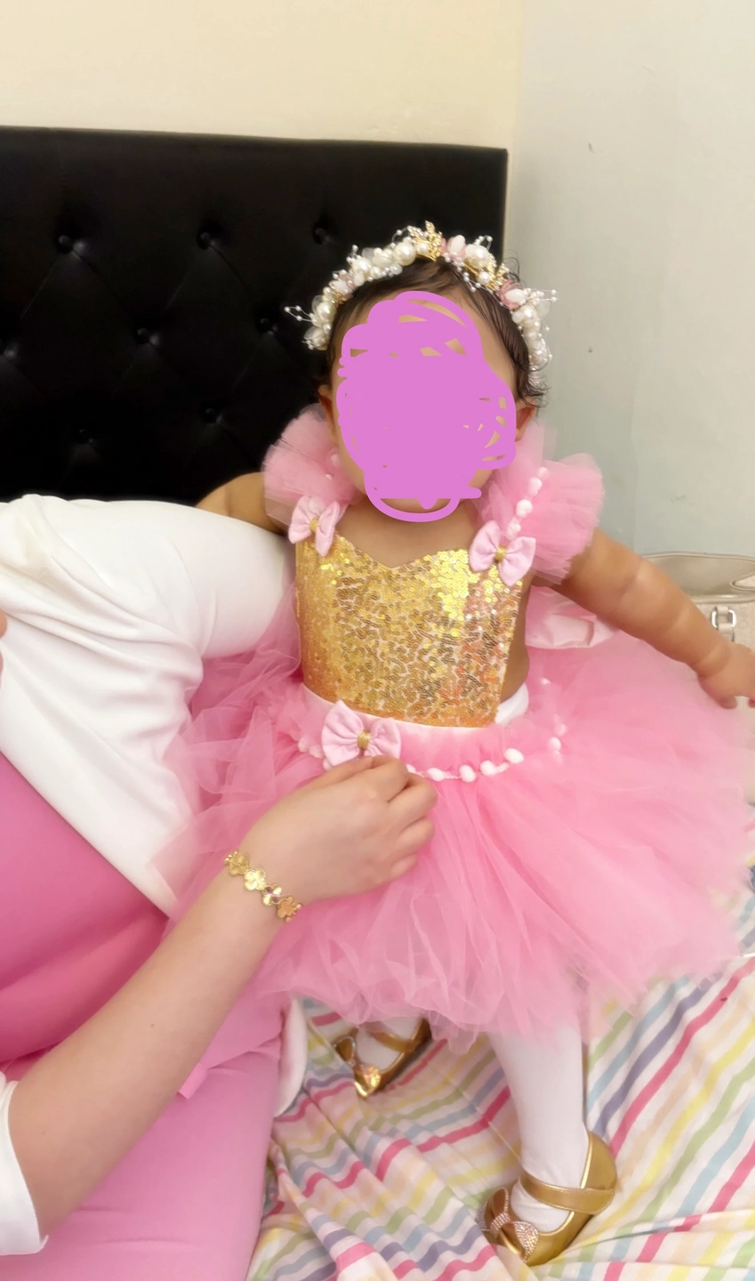 Adorable pink tulle tutu dress with a gold sequin bodice. It features a delicate pearl and floral crow , perfect for a special occasion like a birthday party or photoshoot. Includes matching gold ballet shoes. Size 2T.