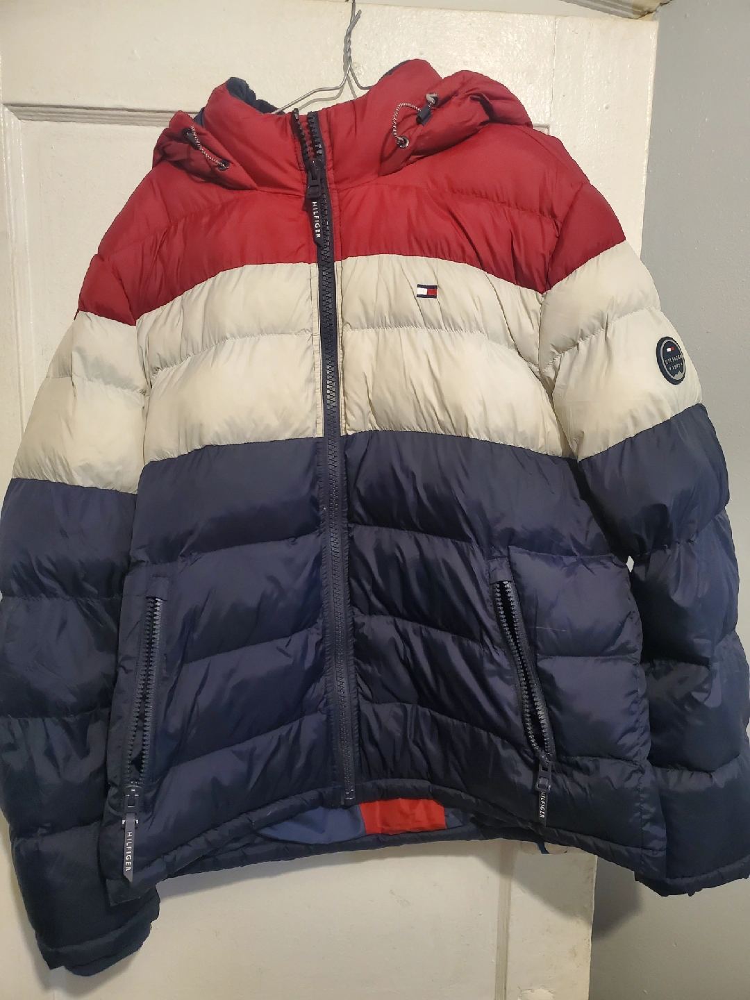 It's a size large and features a stylish red, white, and blue color block design. It has a hoodie and inside zipper pocket. It's very warm like down, water-resistant, and wind-resistant, perfect for the Canadian weather!