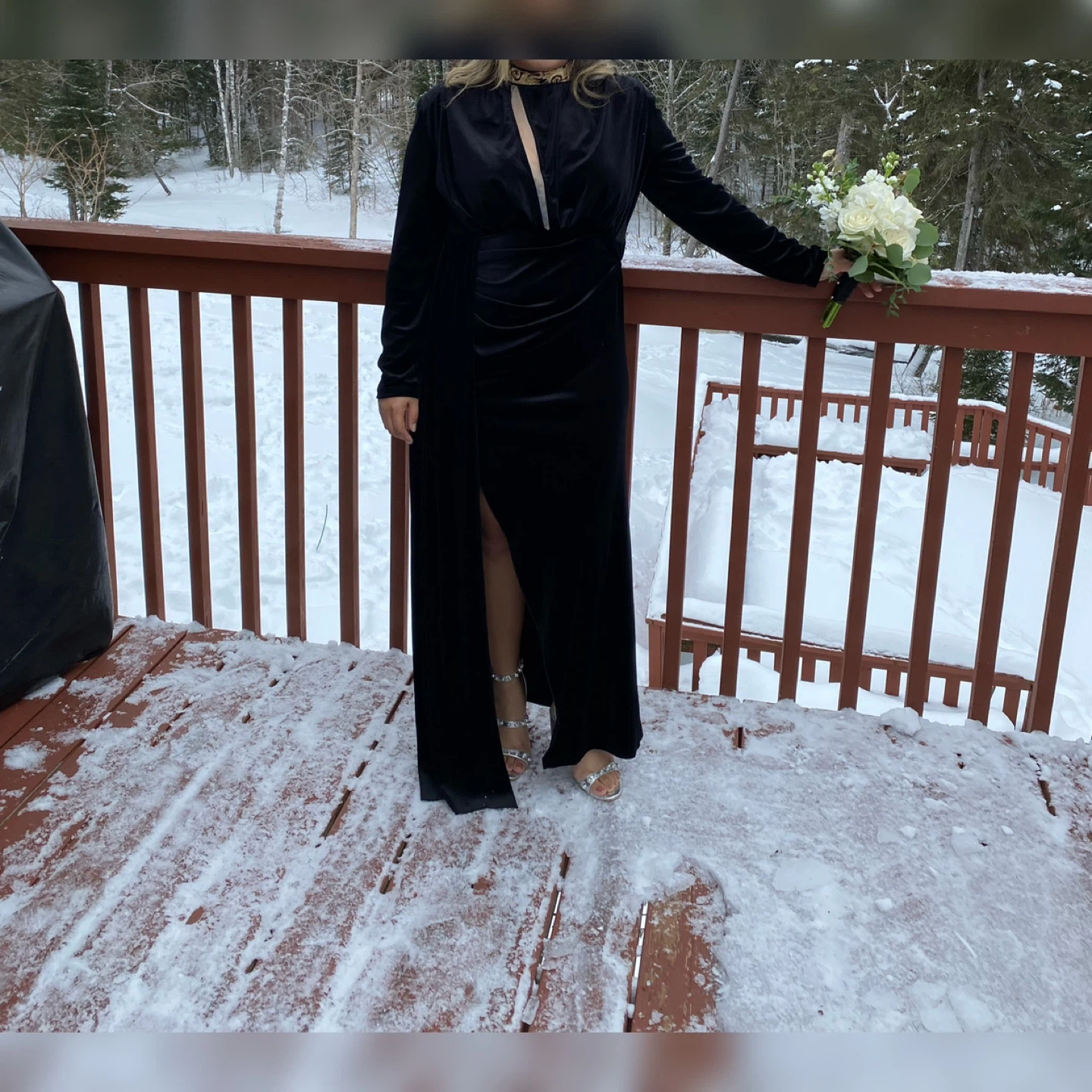 Selling a beautiful black velvet maxi dress. It has a stylish slit and long sleeves, perfect for a special occasion. It's in great condition and ready for a new home!