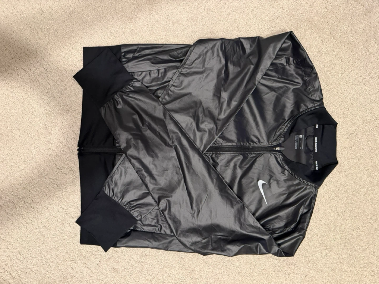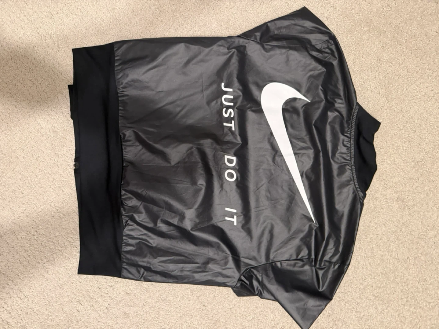 This is a black Nike running jacket with the "Just Do It" slogan on the back. It's lightweight and suitable for active wear. Made with durable materials for performance.