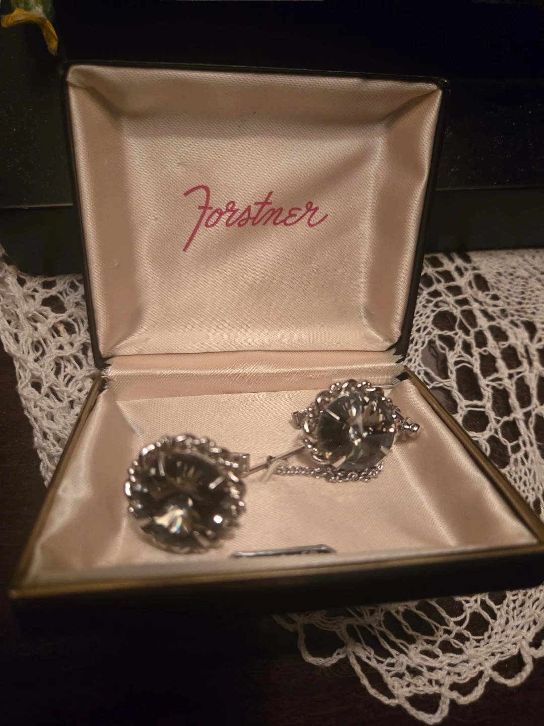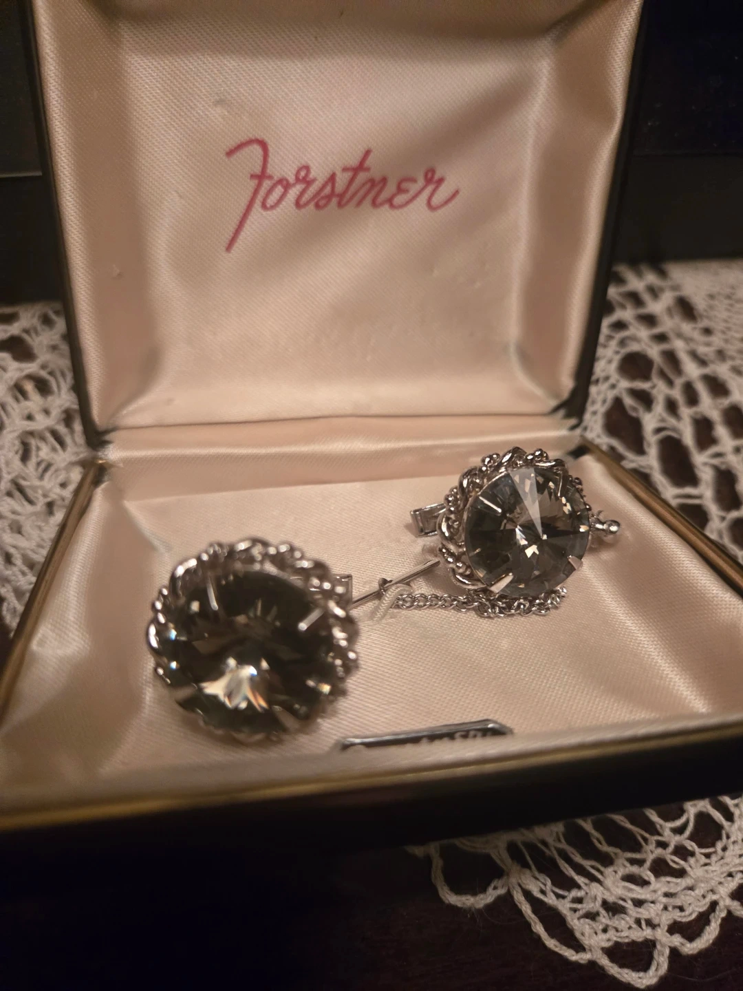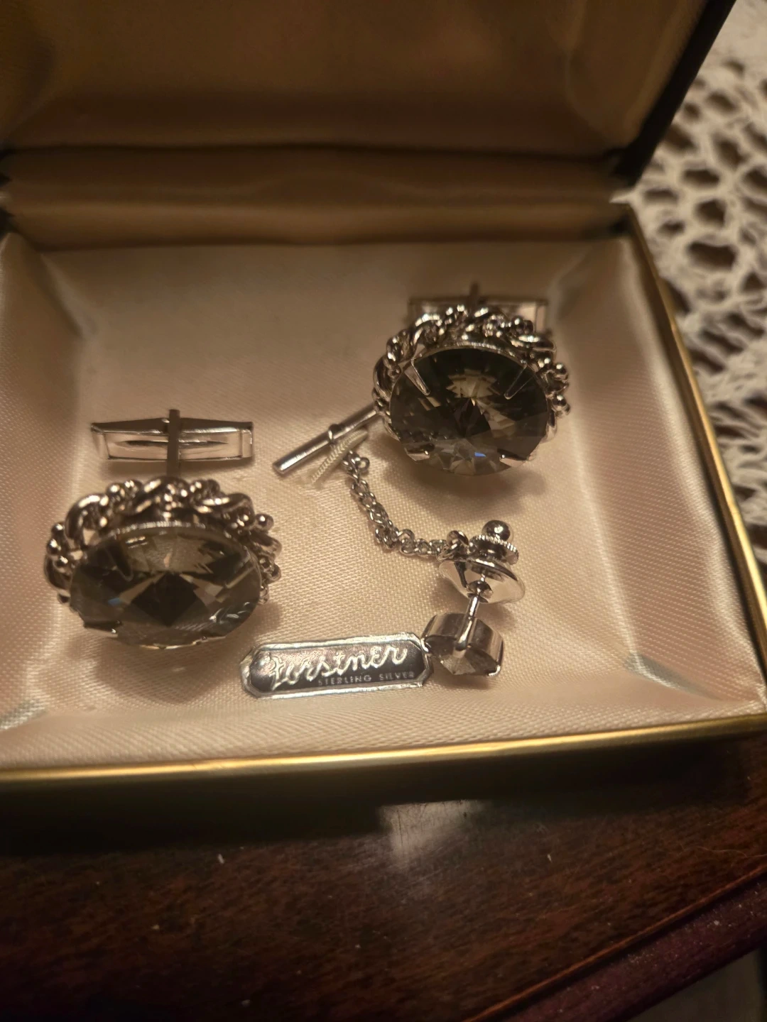 A vintage Forstner sterling silver cufflink and tie clip set. Features a classic design with smoky grey stones. Includes original box for safekeeping.