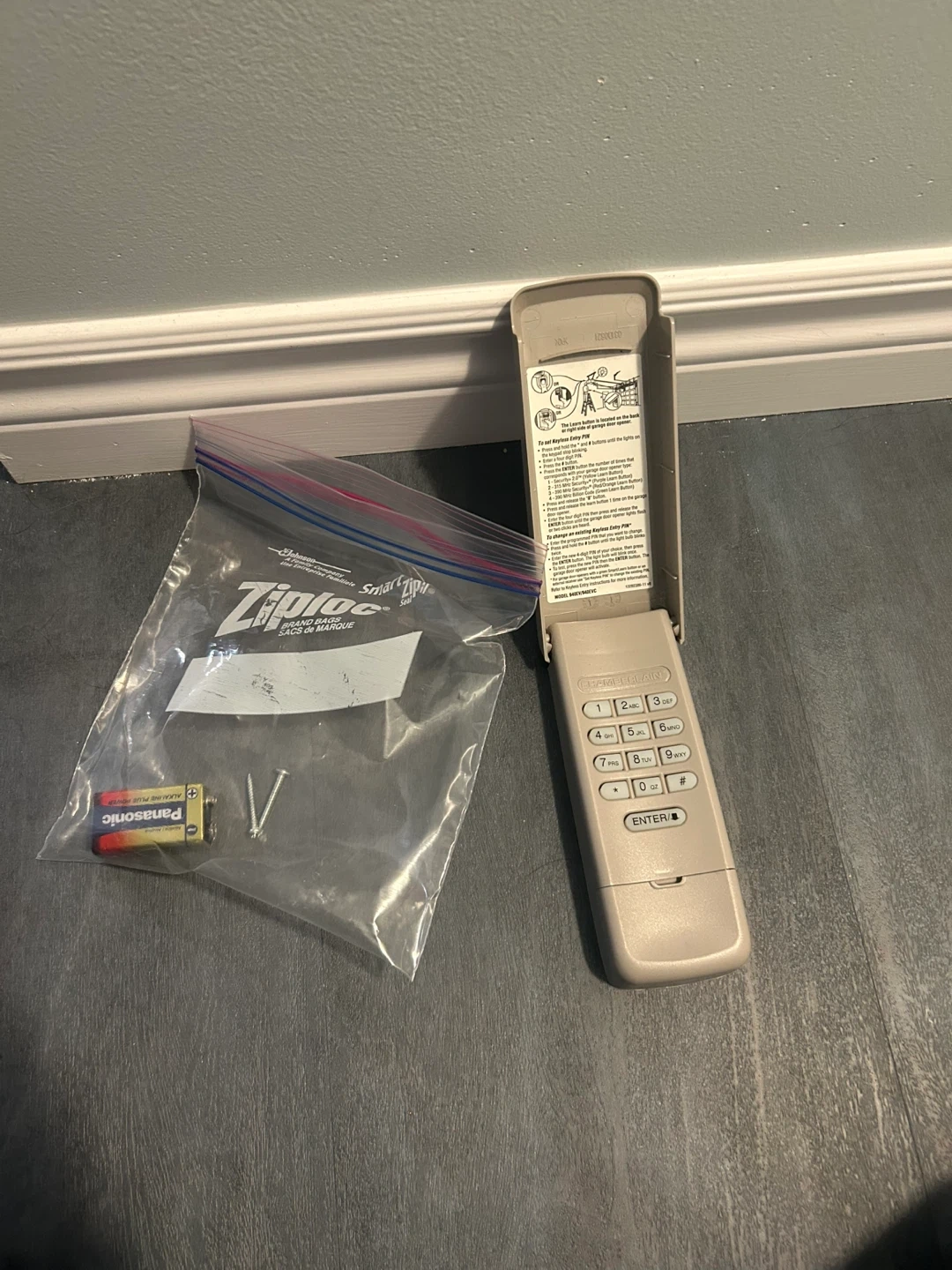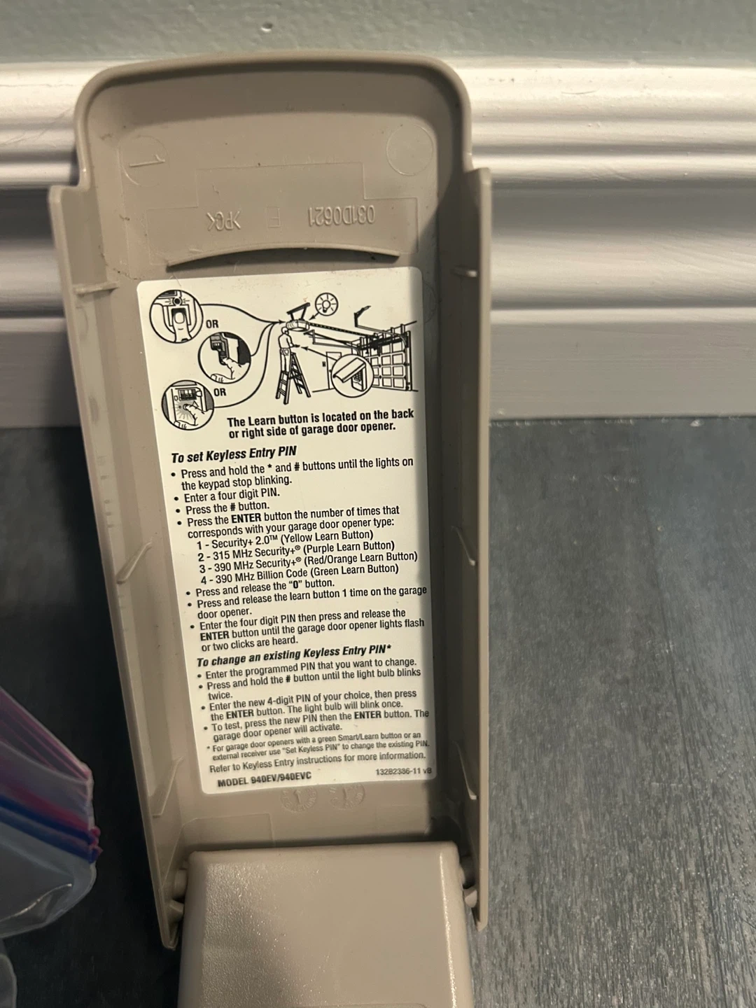 Selling a entry pad for your garage door! The model number is 940EV/940EVC. It comes with a battery and mounting screws. The instructions on how to set a keyless entry PIN are printed on the inside of the cover.