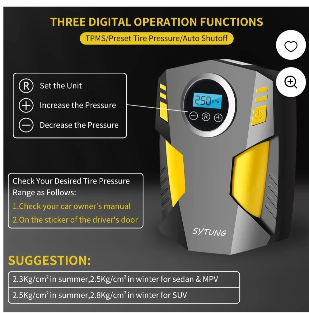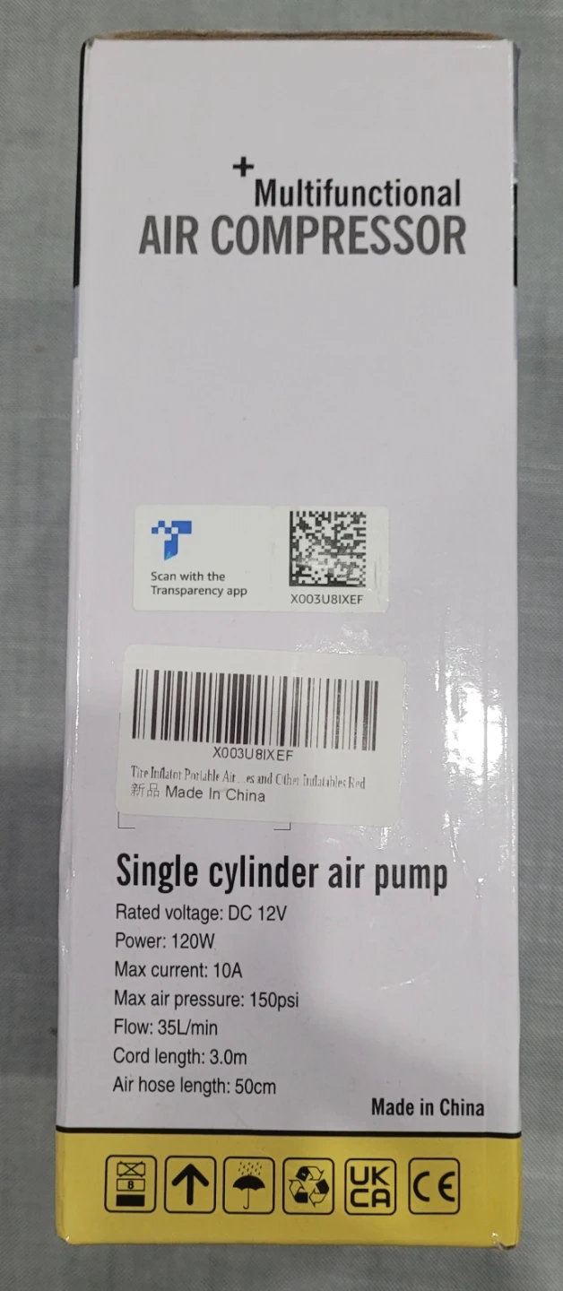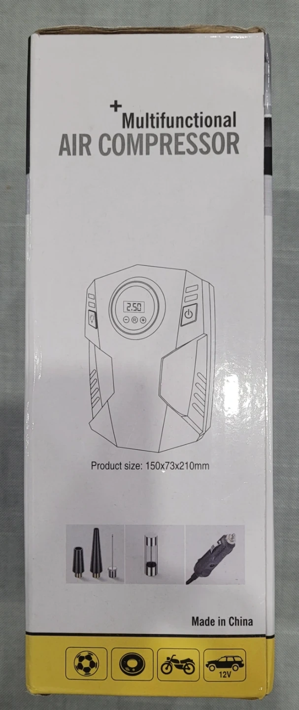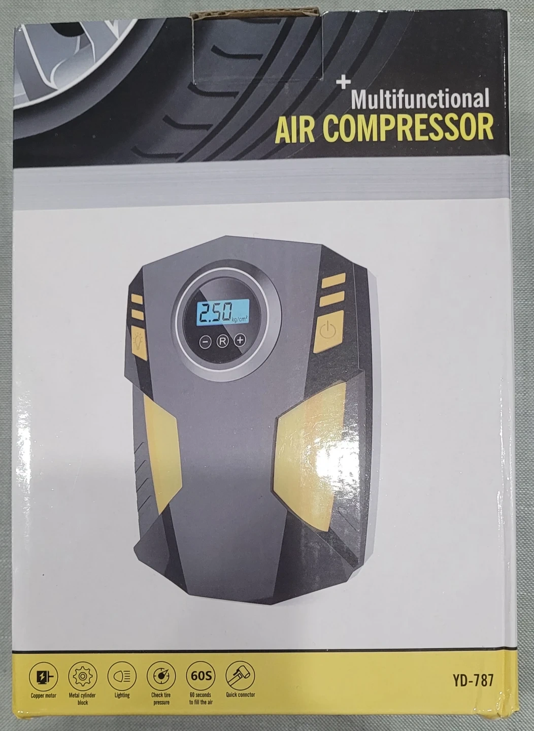 I'm selling a new Sakaki multifunctional air compressor, model YD-787, perfect for inflating tires and other inflatables. It's a single-cylinder air pump with a rated voltage of DC 12V, power of 120W, and a max current of 10A. It can handle a max air pressure of 150psi and has a flow rate of 35L/min. The cord length is 3.0m, and the air hose length is 50cm.