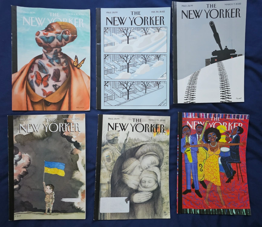 12 The New Yorker magazines up for grabs. Issues from Dec 27, 2021 to March 28, 2022. Doing a little spring cleaning and just clearing up some space