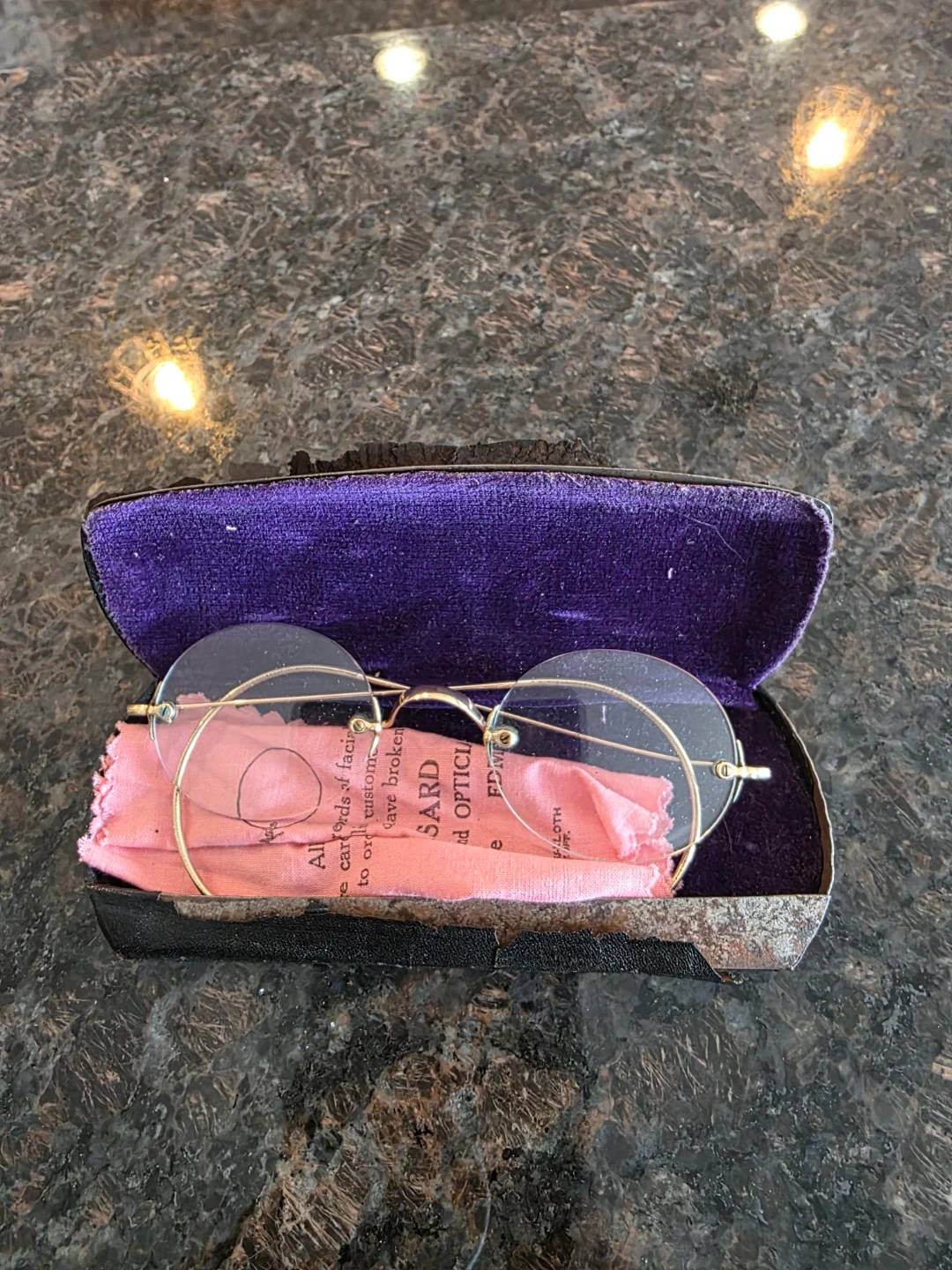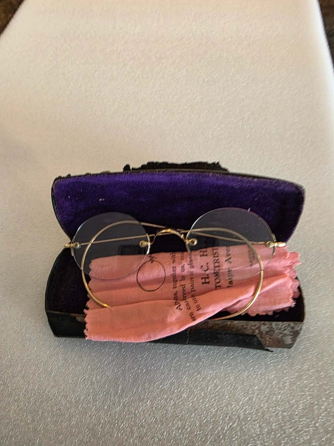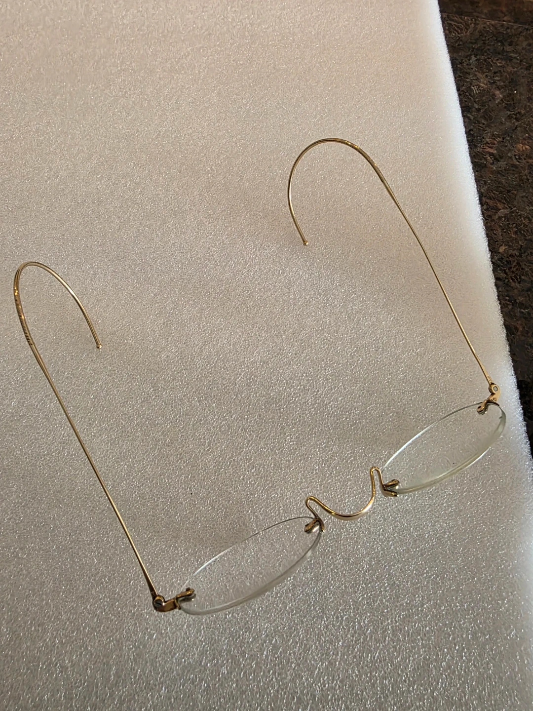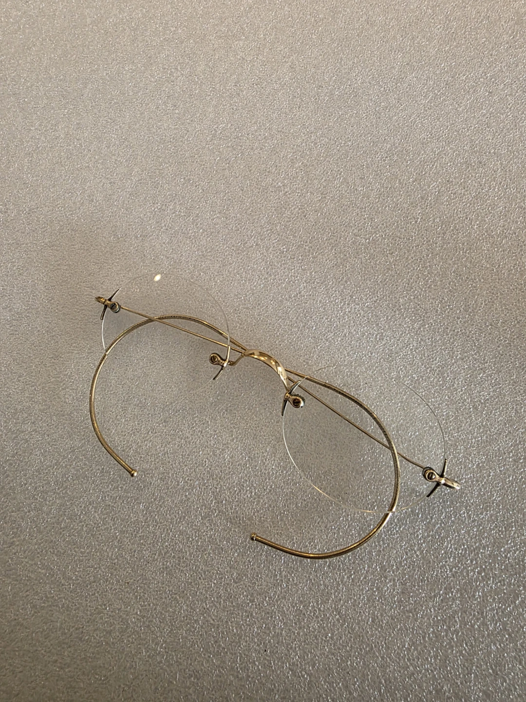 These are vintage rimless eyeglasses with gold-tone frames. They come with their original protective case. The lenses are clear and the frames appear to be in good condition. It's a classic accessory!