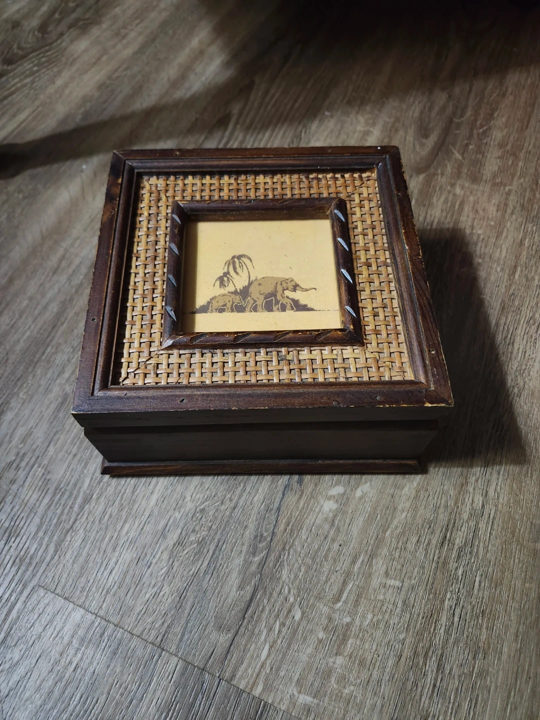This wooden box features a woven rattan inlay and a small framed picture on the lid with an elephant carving. It's a unique piece for storing small items. Perfect for adding a touch of rustic charm to your decor.