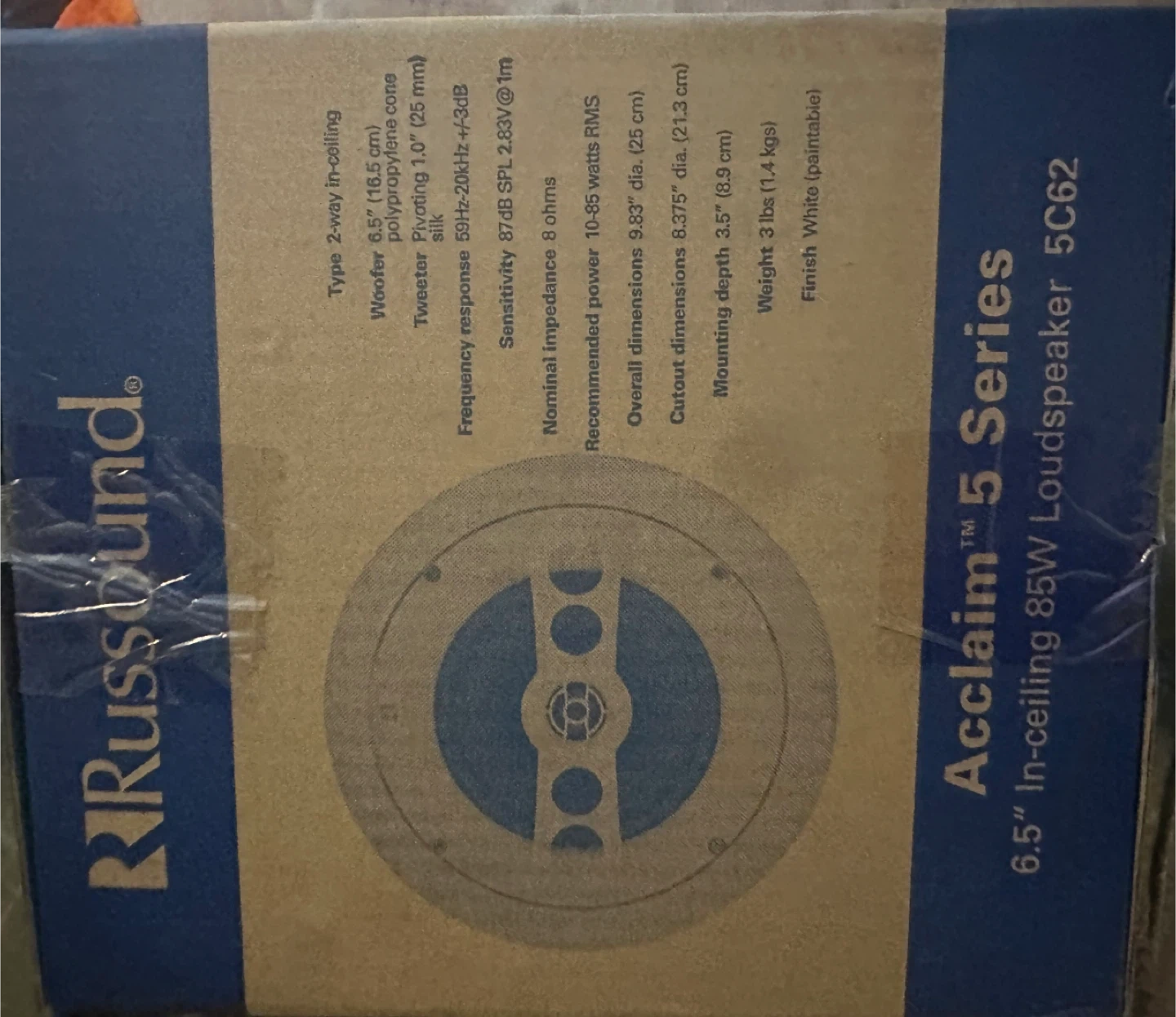This is a Russound Acclaim 5 Series 6.5" in-ceiling loudspeaker. It's a 2-way in-ceiling speaker with an 8 ohm nominal impedance. The recommended power is 10-35 watts, and it has a frequency response of 50Hz-20kHz. It weighs 3 lbs.