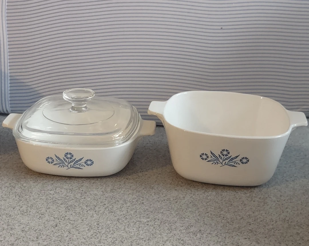 This is a classic CorningWare casserole dish in the blue cornflower pattern. It's made of durable pyroceram and includes a clear glass lid. This 1-quart dish is perfect for baking or serving small dishes. It's made in the U.S.A.!