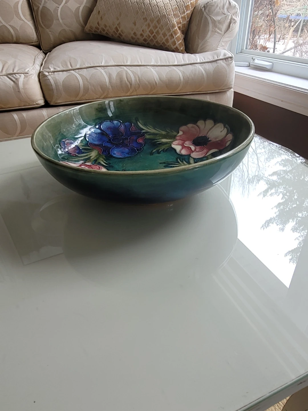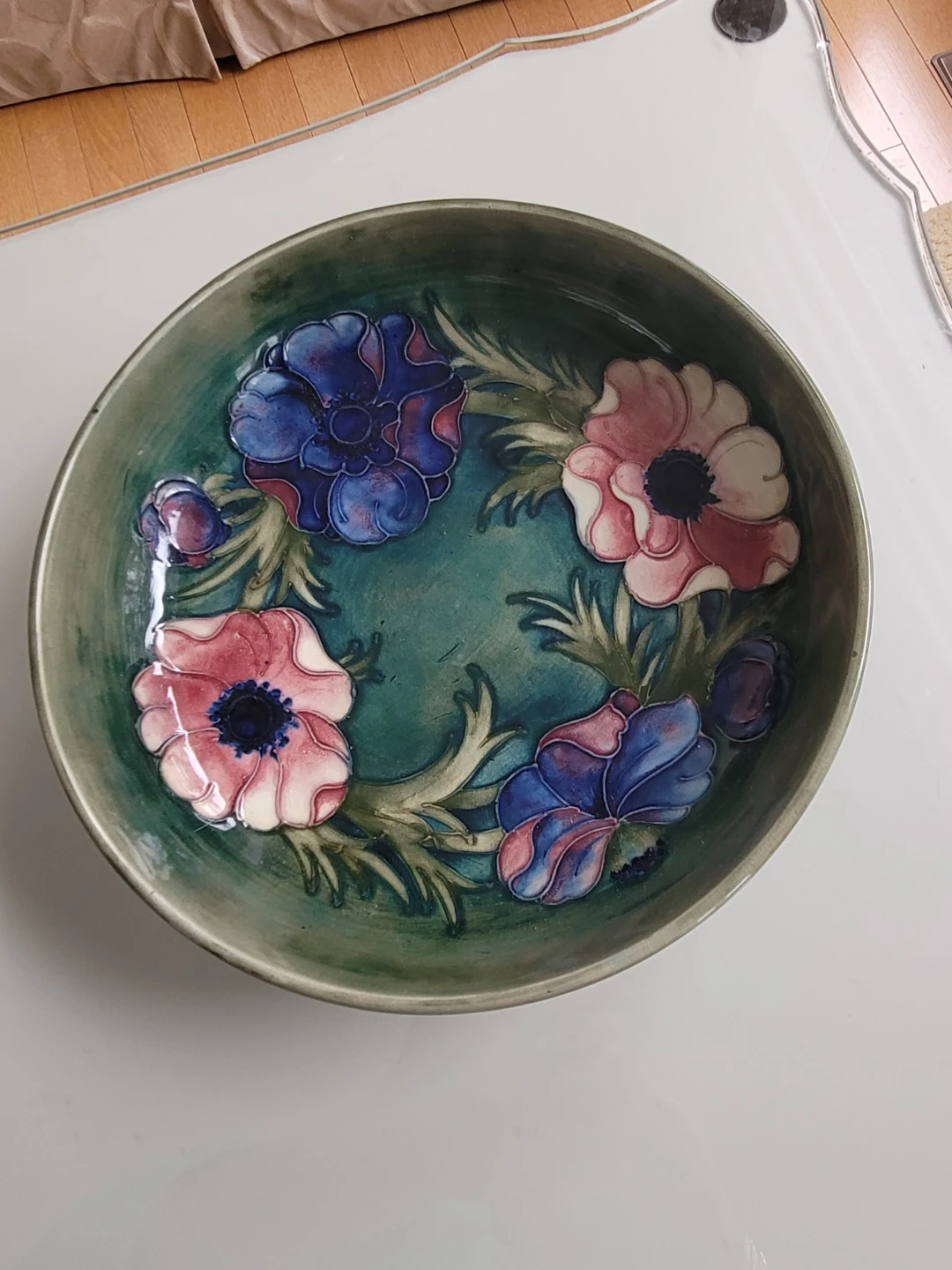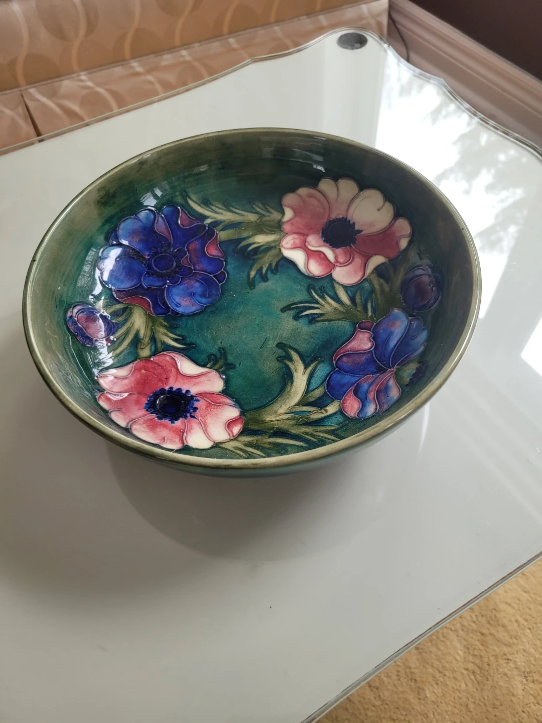 Vintage "MOORECROFT" Japanese Anemones pattern bowl It has a glossy dark green & navy exterior and a patterned floral interior. Signed on base both Green and Blue. I think this one is by the father William as the color pallet is older?