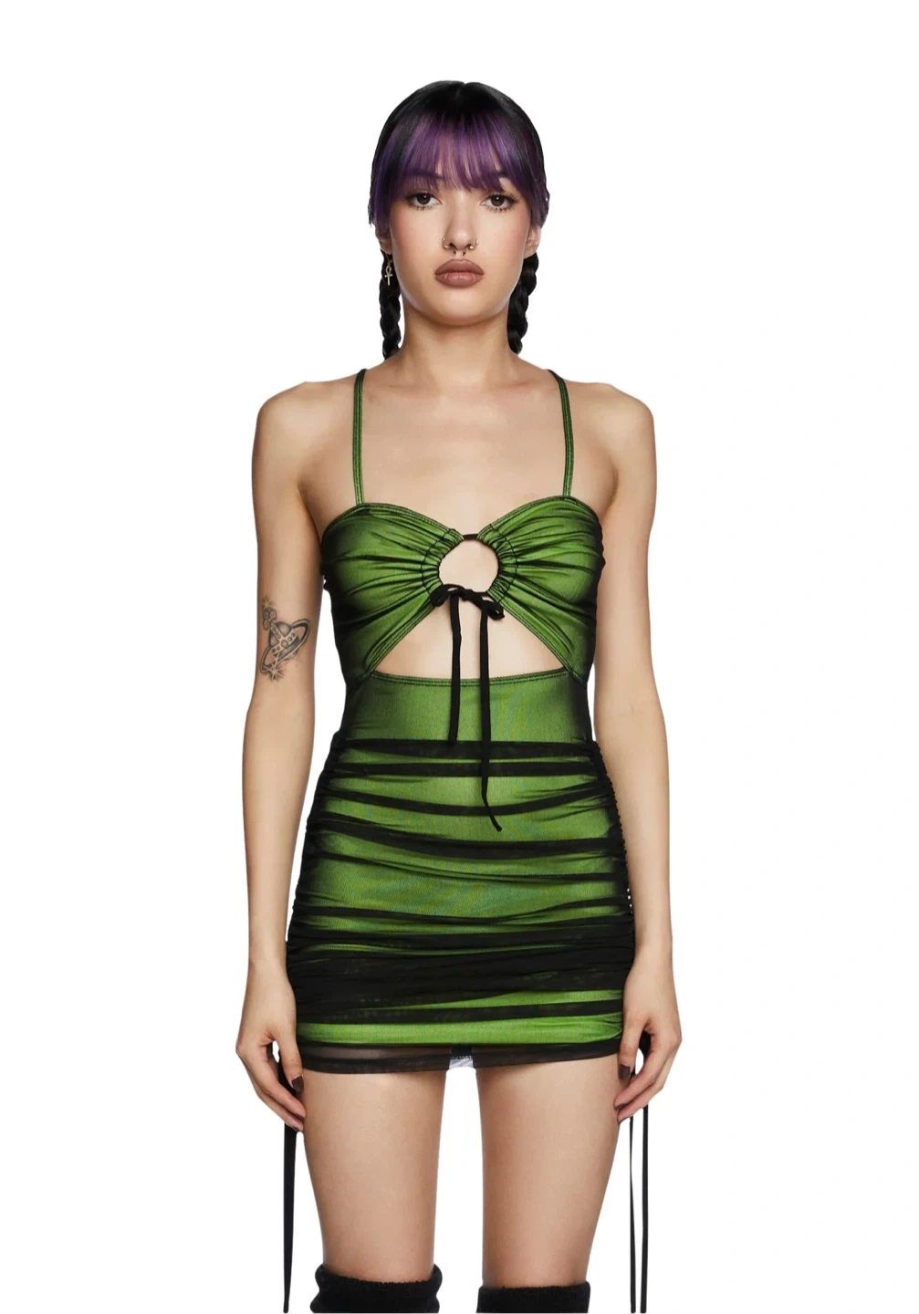 Make it worth going out in this mini dress with a bodice cut out, an O-ring ruched bust, adjustable shoulder straps, ruched detailing with adjustable side tie closures, and a slinky mesh overlay.