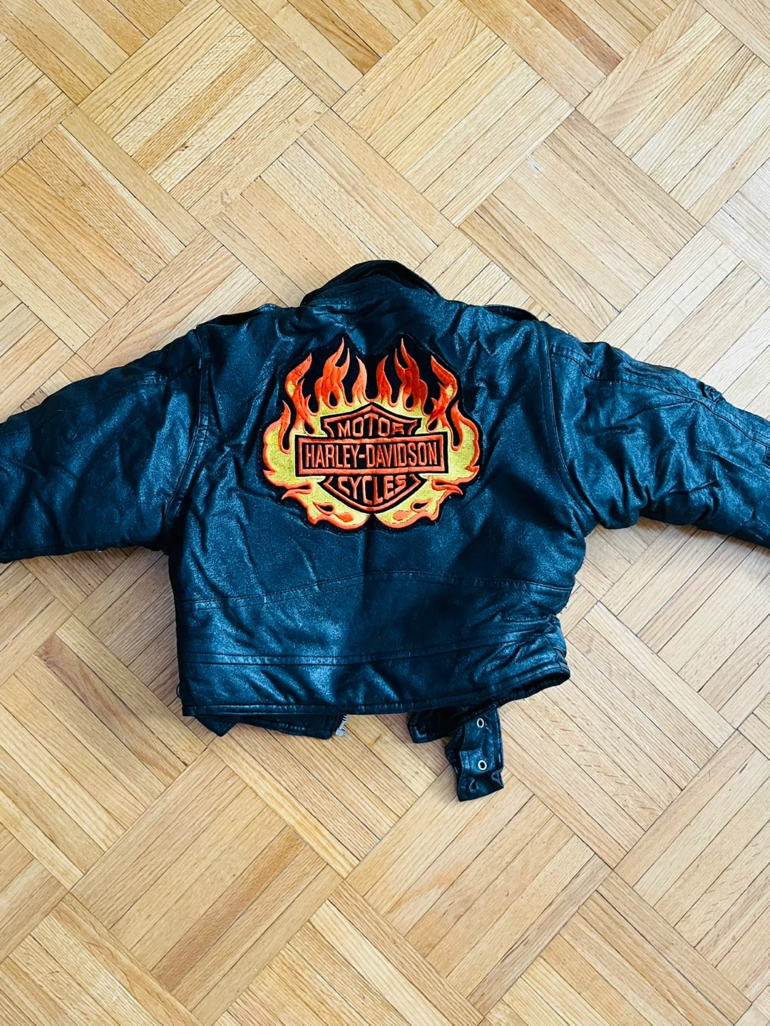 Harley-Davidson kids leather jacket, perfect for your little biker! It's in great condition and features the classic Harley-Davidson logo on the back and front. There's also an American flag patch on the sleeve. A super cool jacket for any kid!