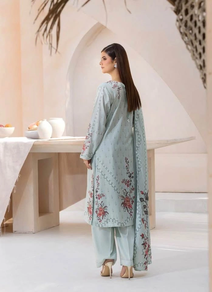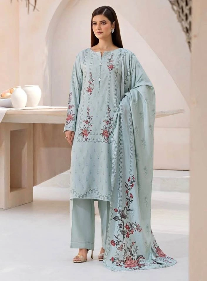 Selling a brand new 3-piece suit, including a top, bottom, and dupatta. Size medium with a chest measurement of 20.5 inches. The fabric is linen. This is a pretty 3-piece ethnic wear set in a light blue color with a floral print. The set features a long top, matching pants, and a matching linen dupatta. It looks very comfortable and stylish.