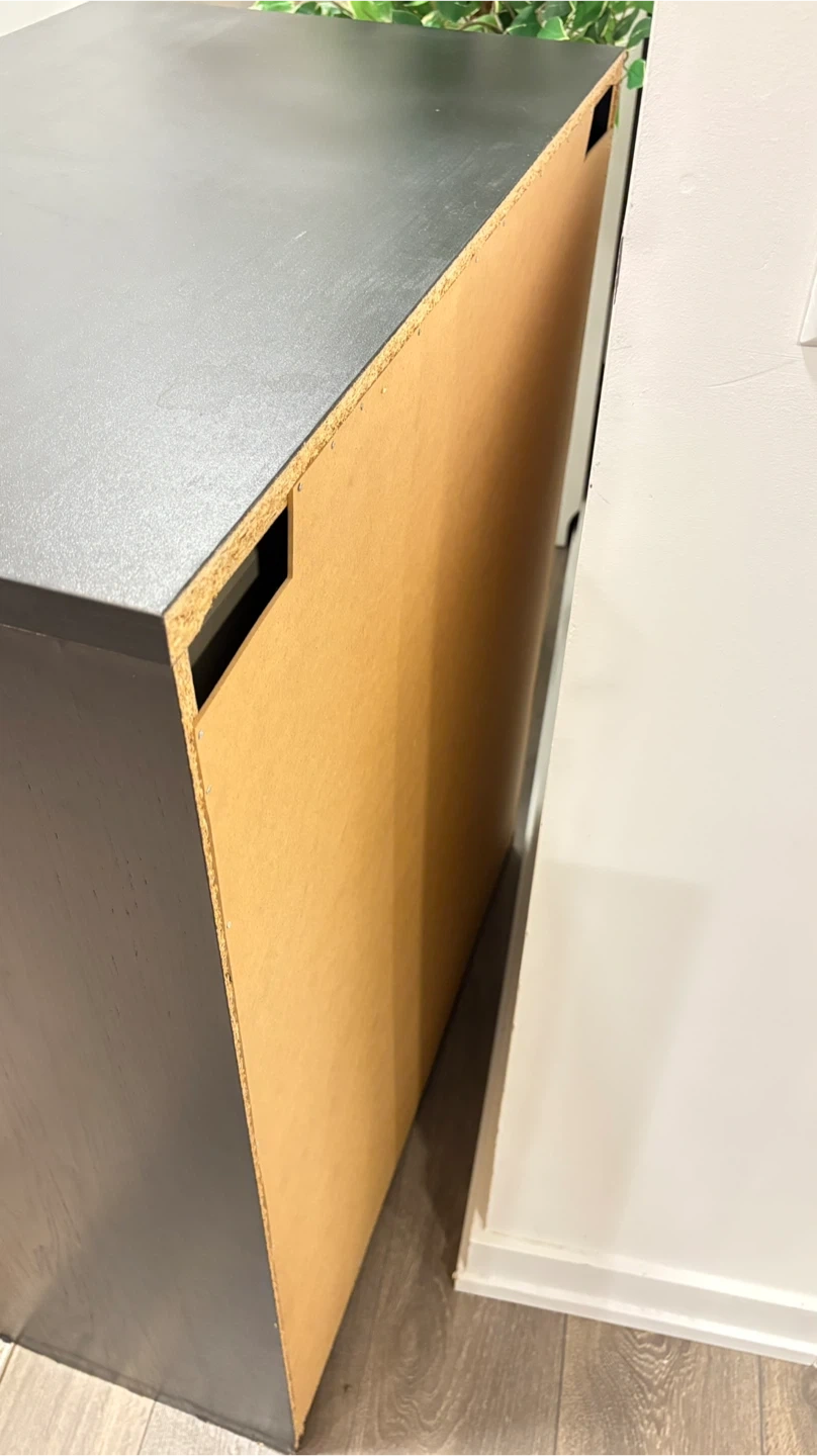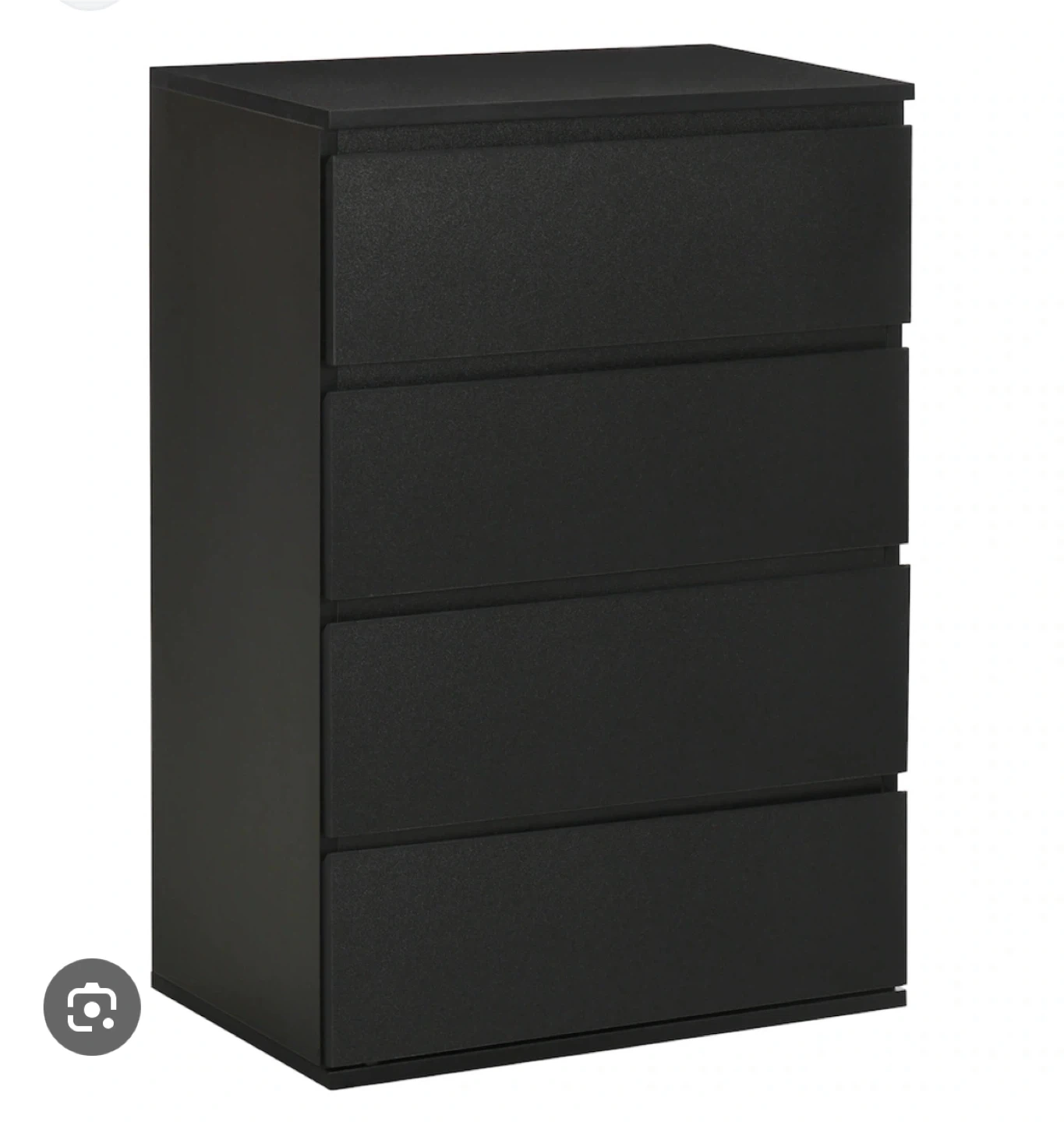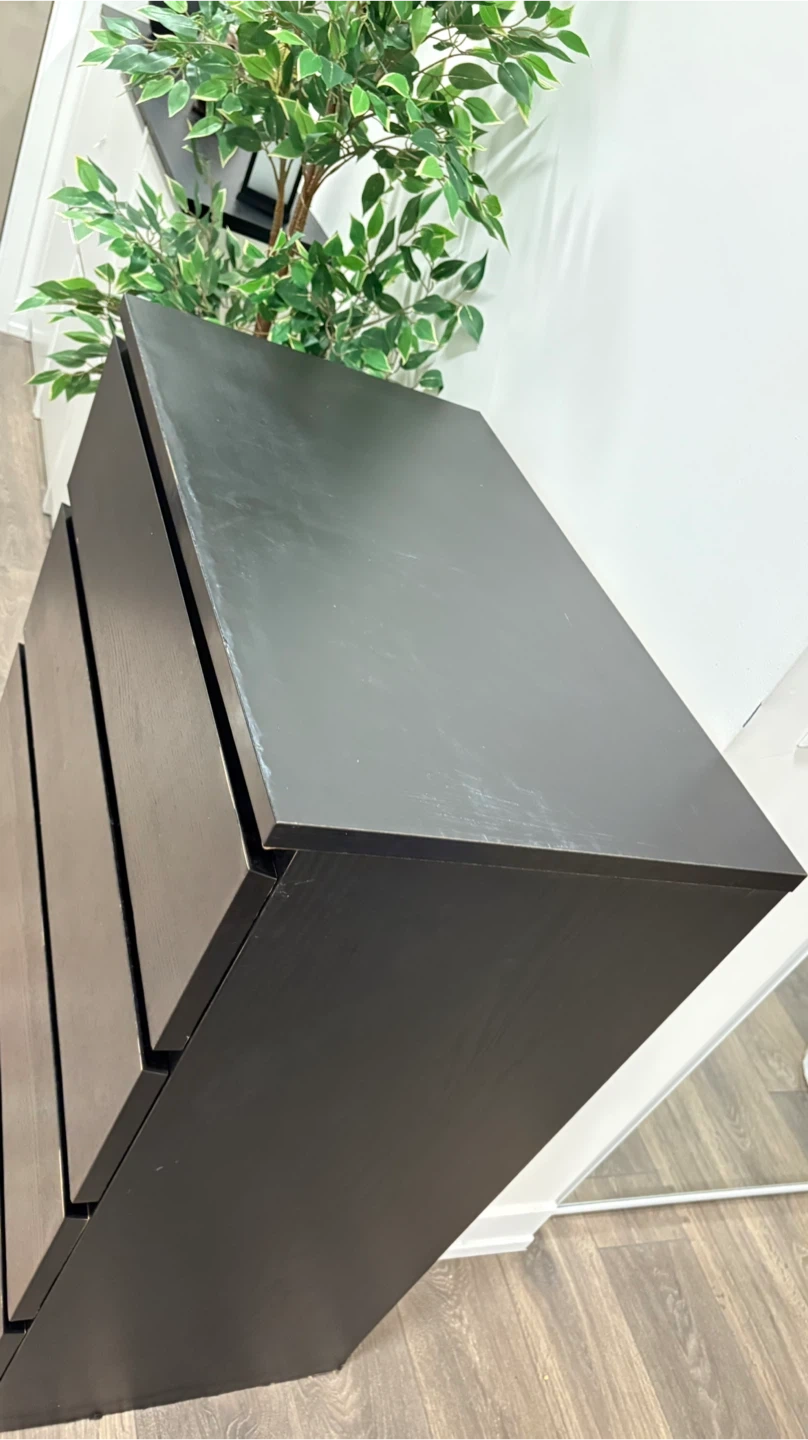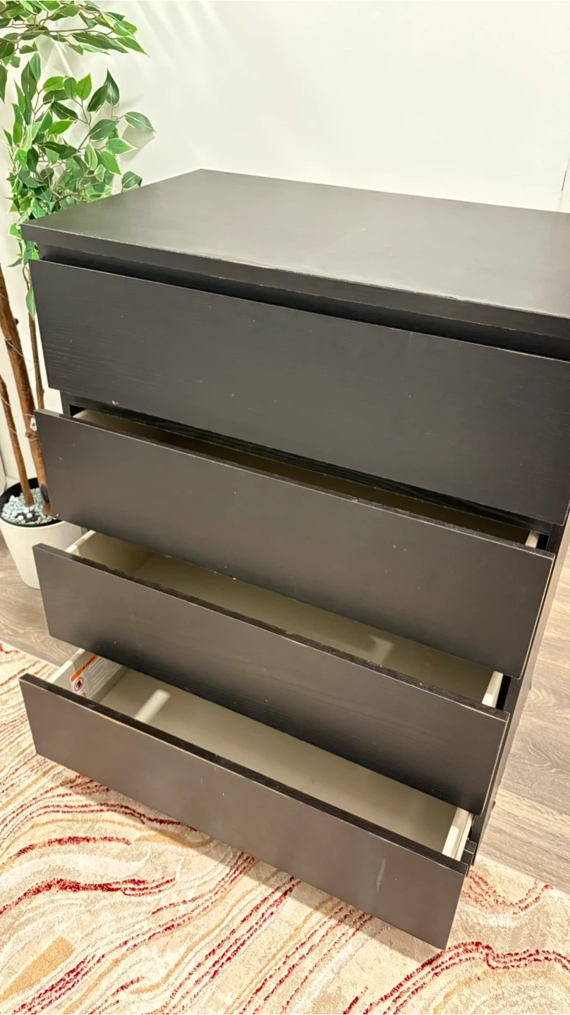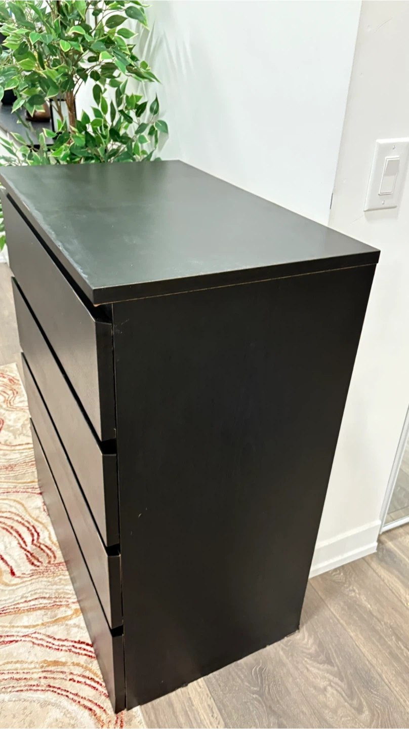 This is a black dresser with four drawers. It's a good size for a bedroom or closet. Plenty of storage space!