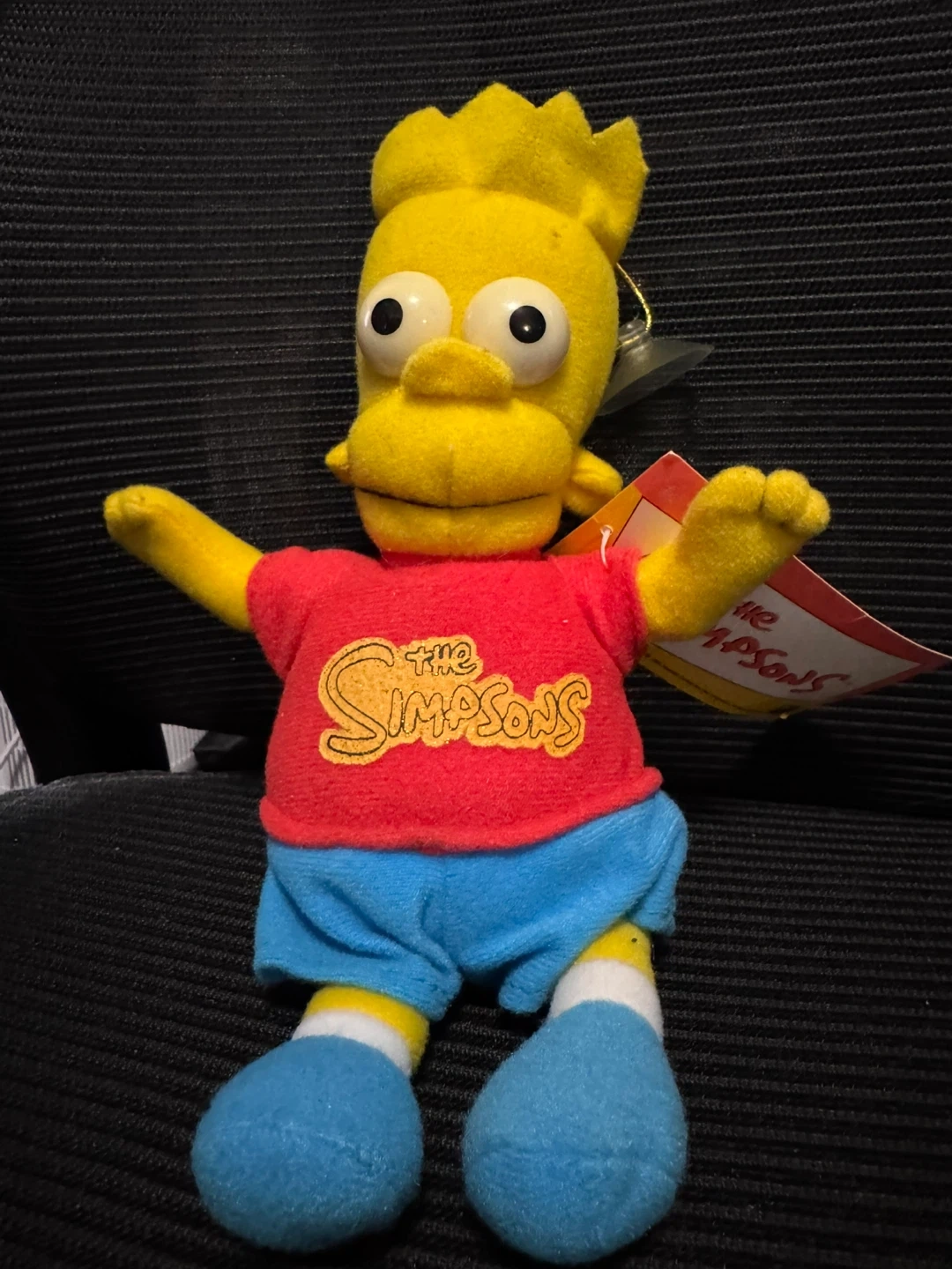 Yellow plush toy of Bart Simpson wearing a red shirt and blue shorts. Features a "The Simpsons" logo on the shirt and "Matt Groening" on the tag. Small to medium size.