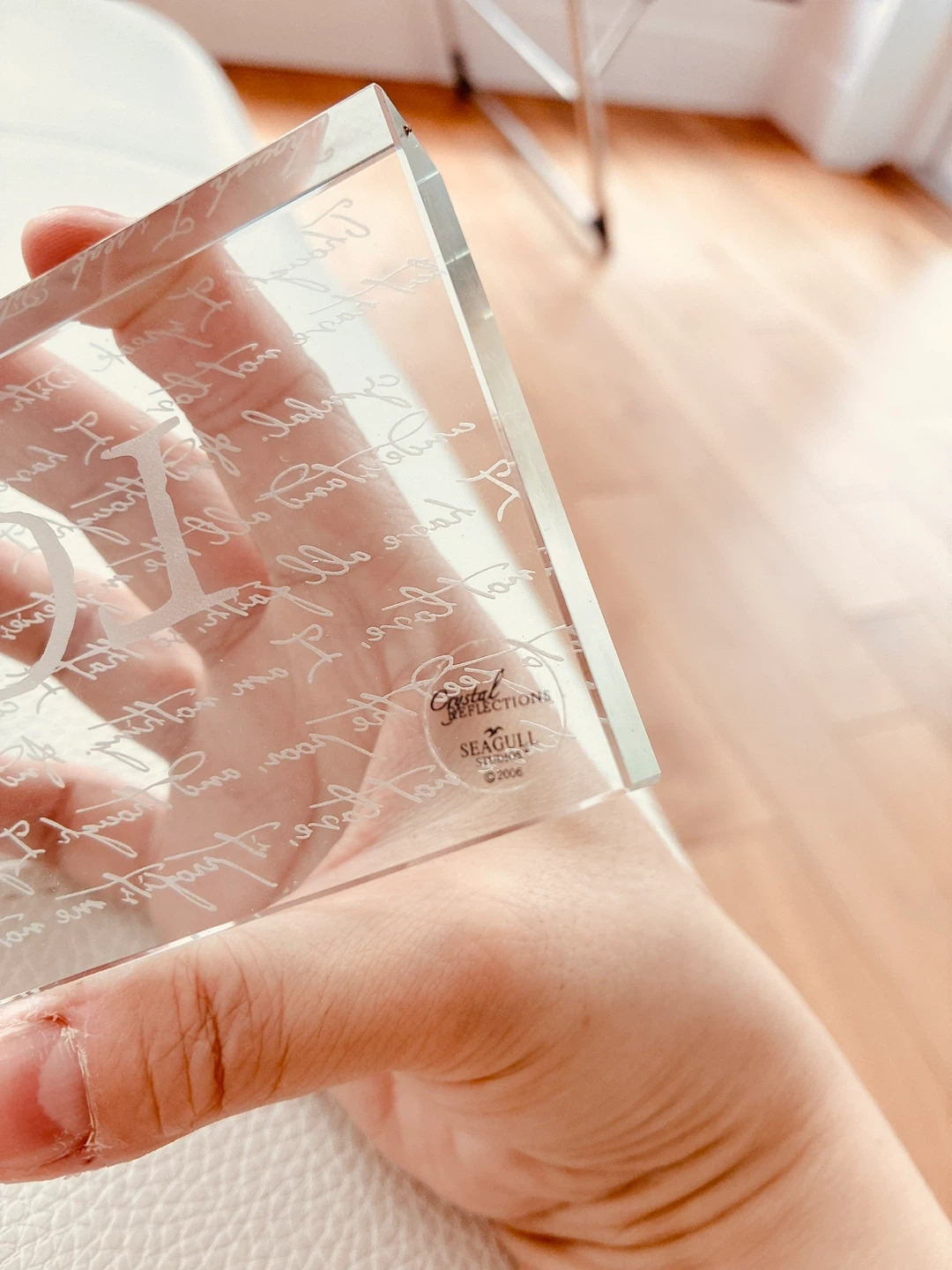 Crystal block with etched "Love" quote. "Though I speak with the tongues of men and of angels, but have not love, I have become sounding brass or a clanging cymbal. Of those that are the prophecy, and understand all the mysteries and all knowledge, and though I have all faith, so that I could remove mountains, but have not love, I am nothing. And though I bestow all my goods to feed the poor, and though I give my body to be burned, but have not love, it profiteth me nothing. ... 1 Corinthians 13". Includes original box.
