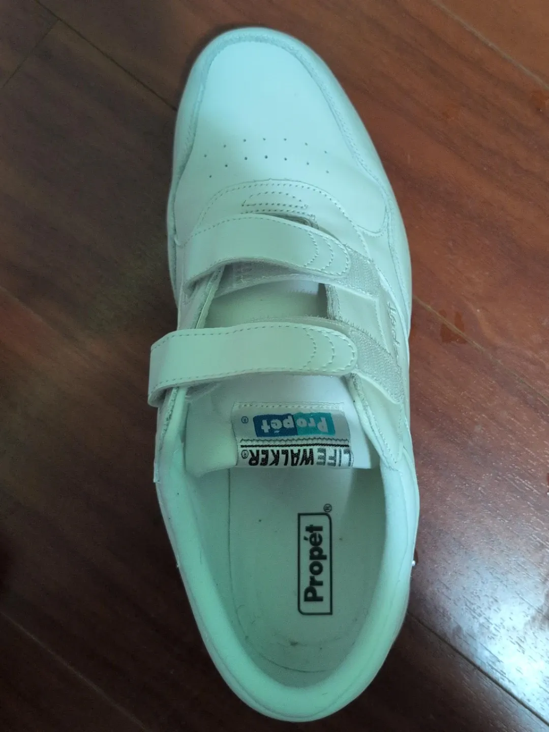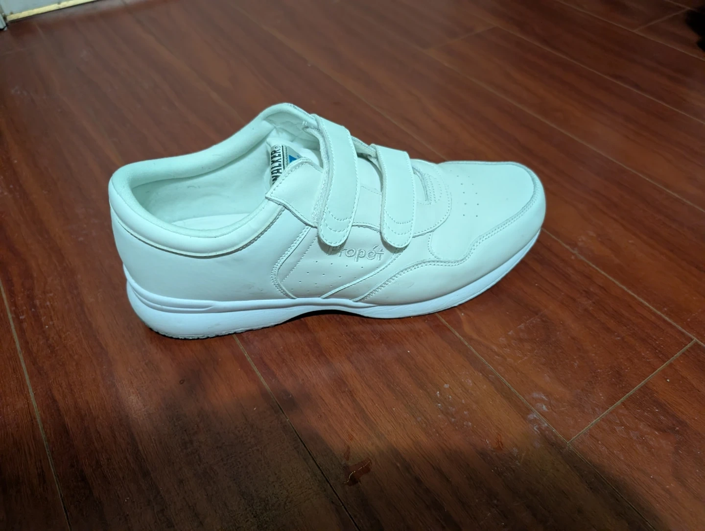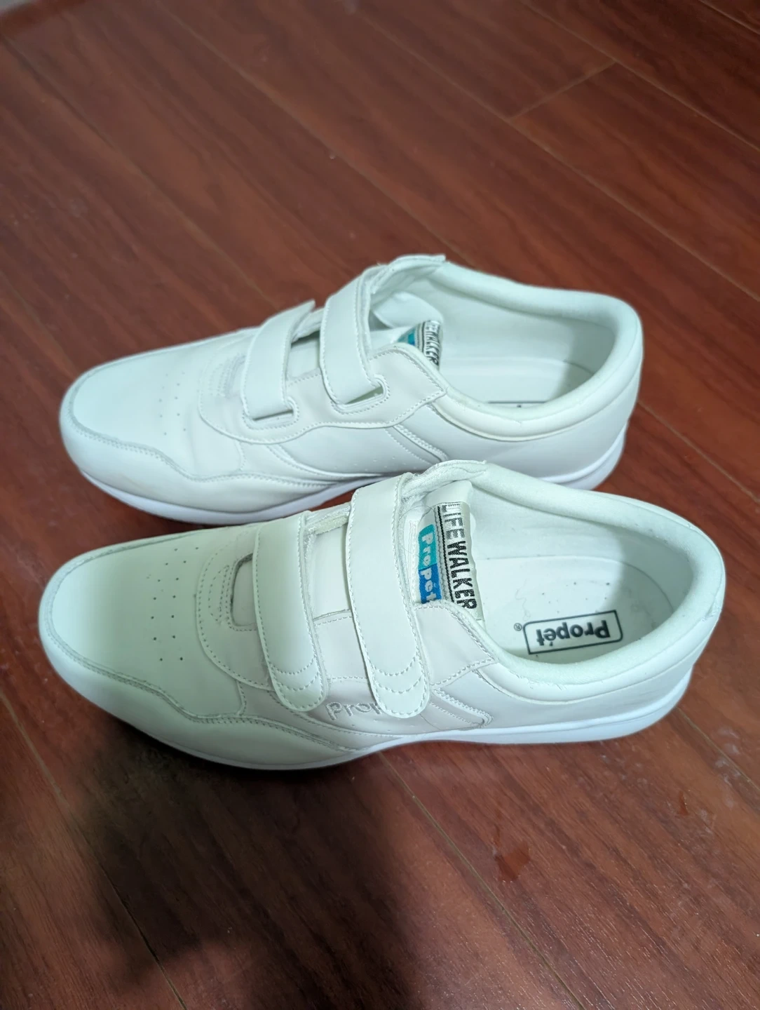 These Propet Life Walker shoes are white with a velcro closure. They are made of leather. These shoes are designed for comfort and support. Size 12. Box available