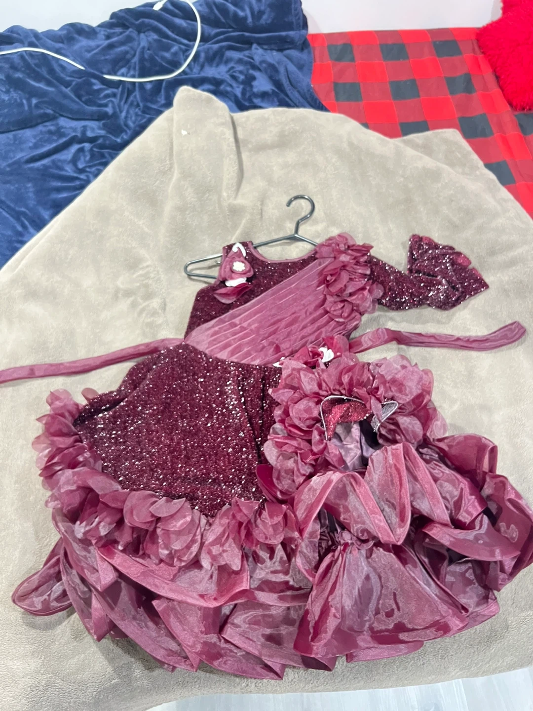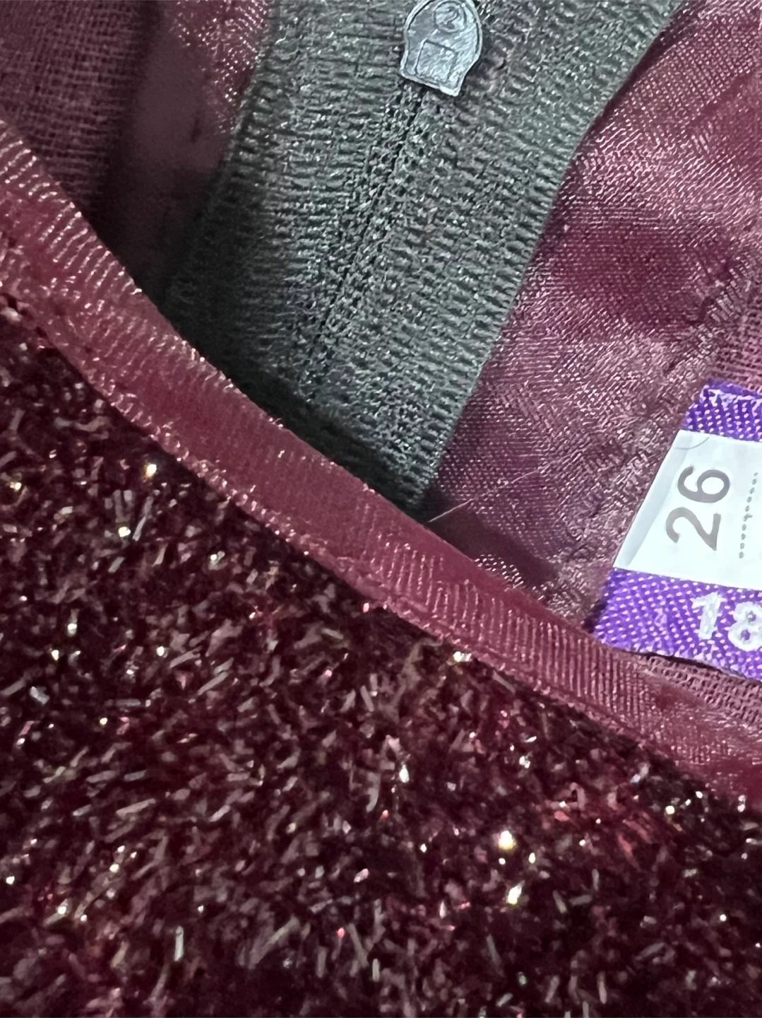 This sparkly performance dress is a vibrant burgundy colour with dazzling sequins on the bodice and sleeves. It features ruffled layers and floral accents for a stunning look. The dress is labelled size 26.