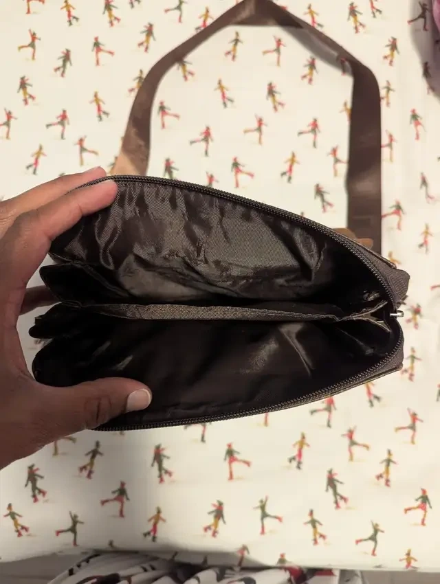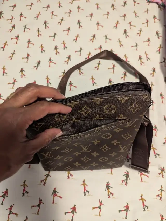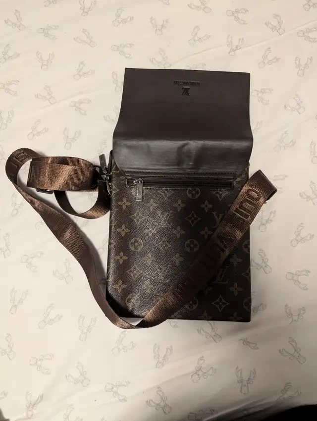 Brown Louis Vuitton crossbody bag with signature monogram print. Features a zip closure and an adjustable strap. Interior has multiple compartments for organization.