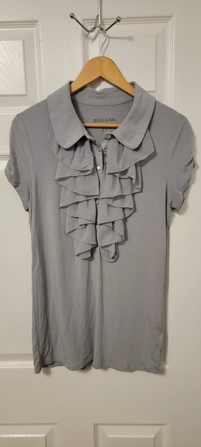 Grey short sleeve top from Mac & Jac. It features a ruffled collared neckline with button accents. Made with a soft jersey fabric. Please note the spot on the ruffle.