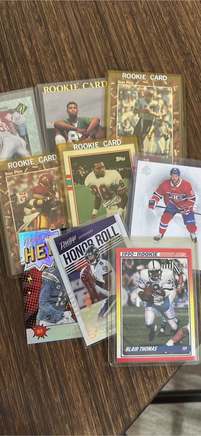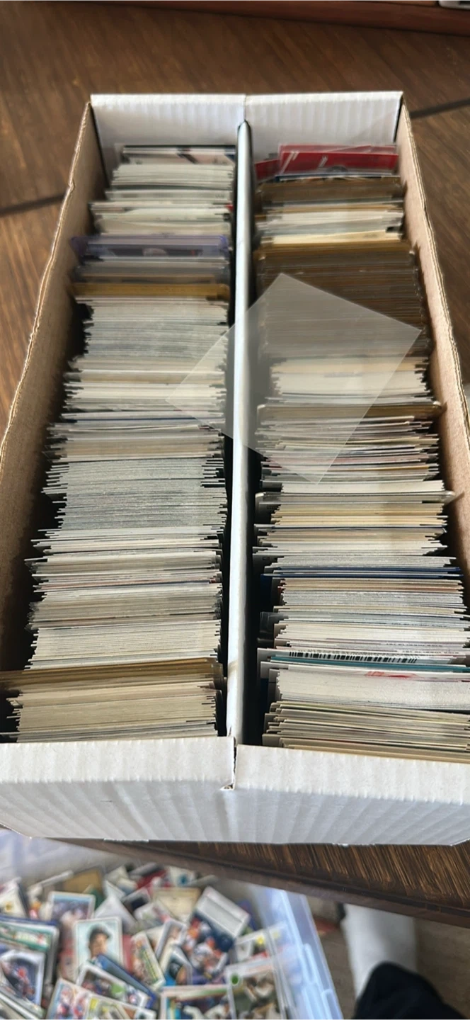 A large collection of assorted baseball, football, basketball, hockey and more trading cards, including rookie cards and various years. The cards are stored in a large plastic bin and a cardboard box.
