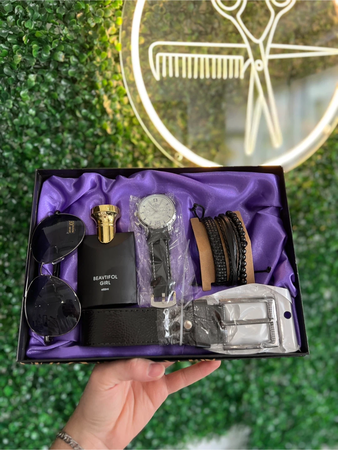 This gift set includes a watch, a pair of sunglasses, a belt, a bracelet, and a bottle of fragrance. All items are presented in a box with satin lining. It's a nice collection of accessories for everyday use or special occasions.