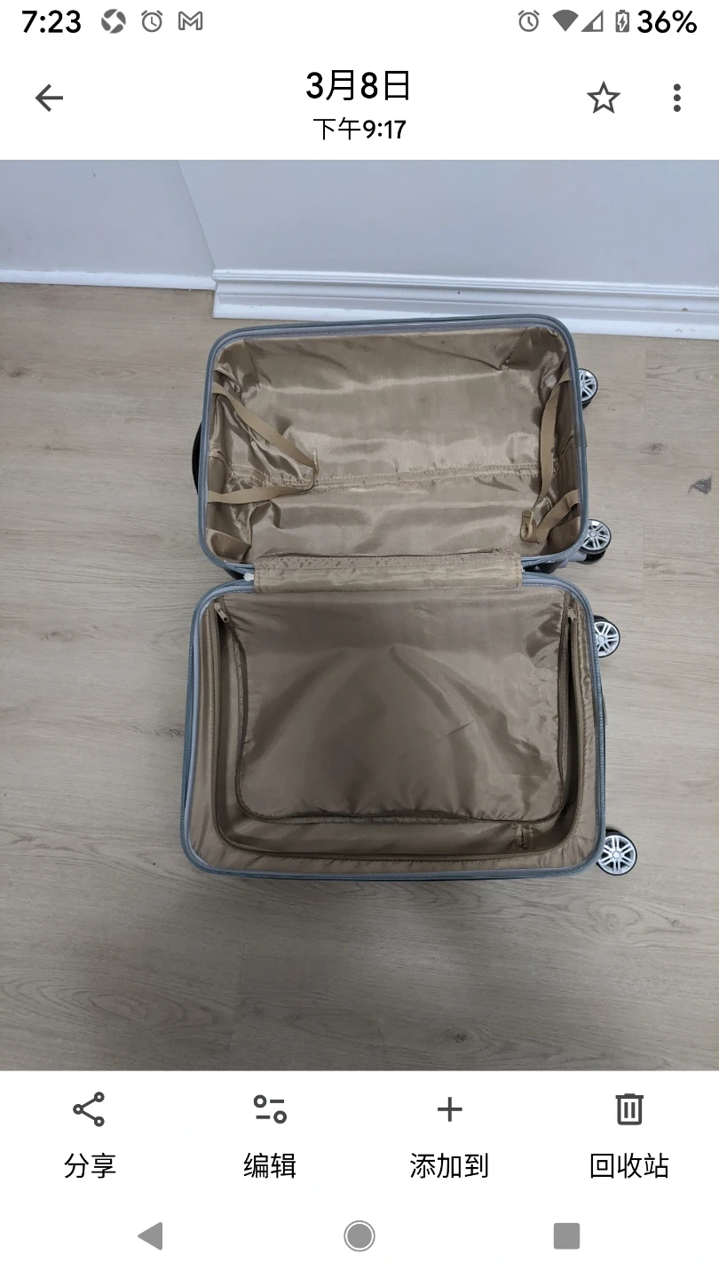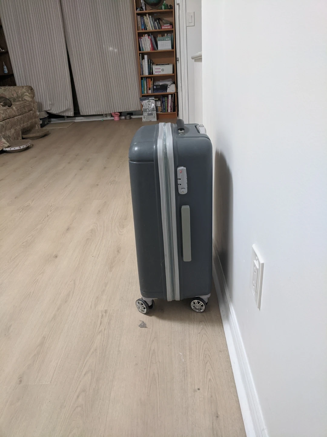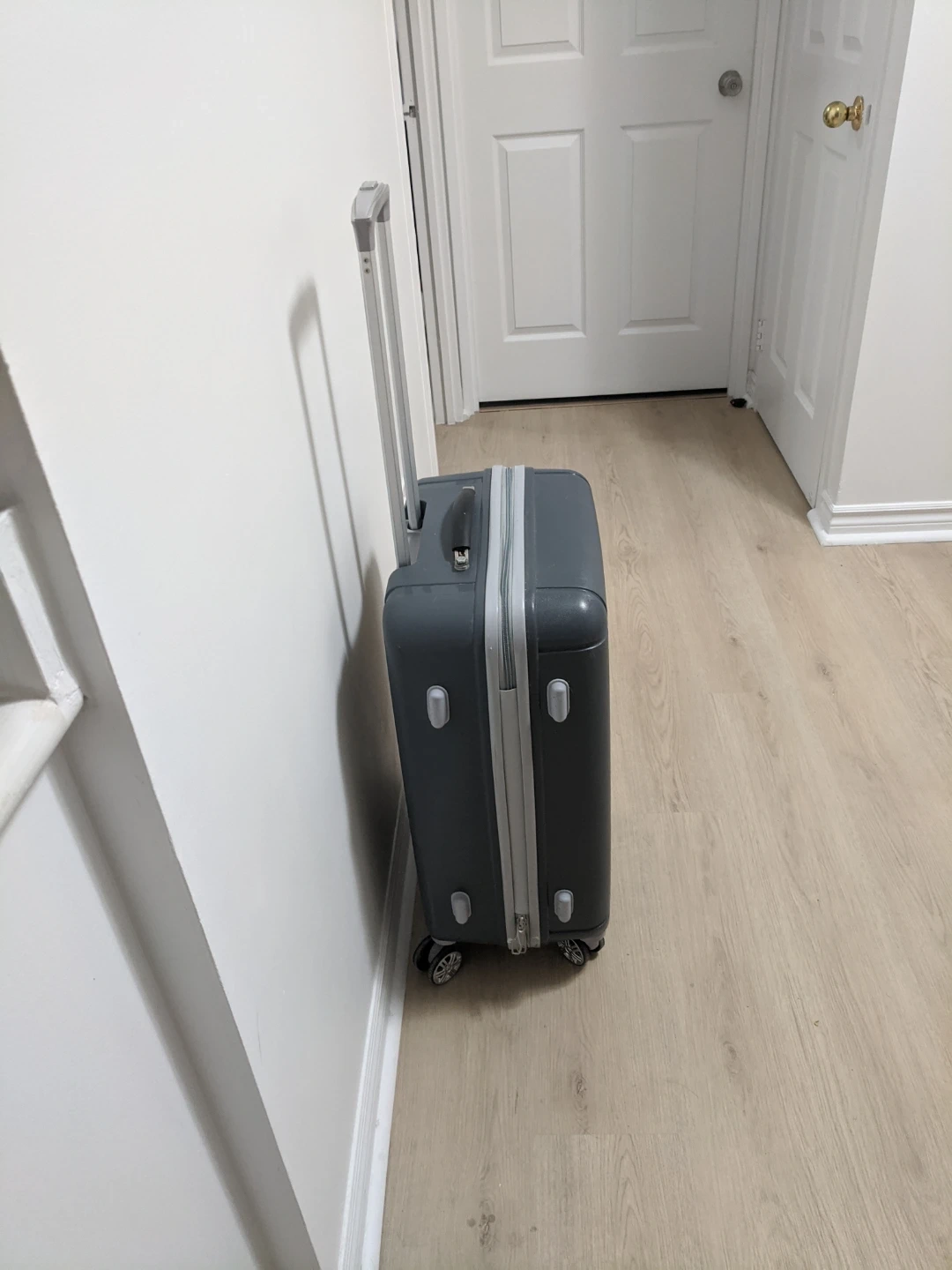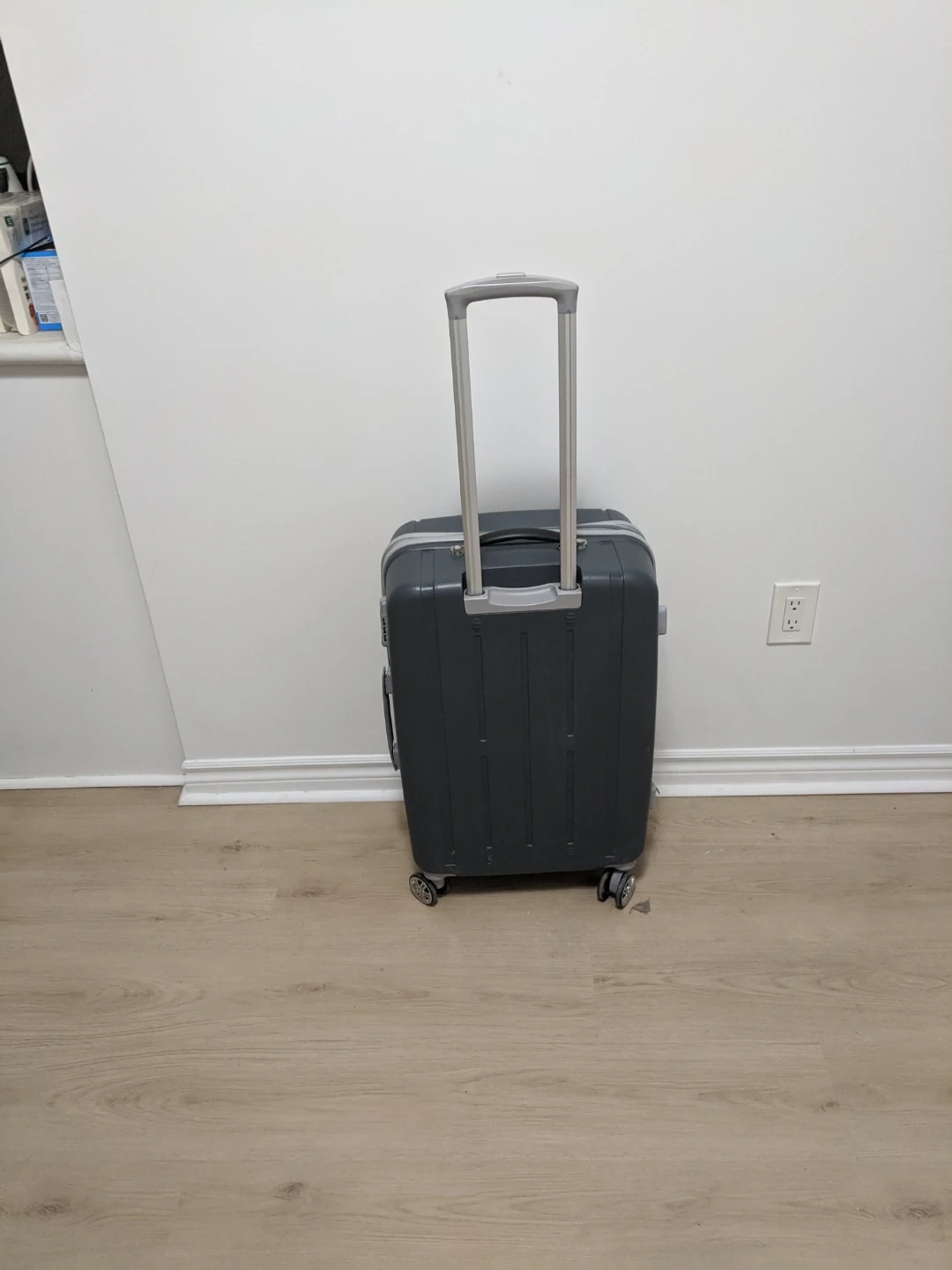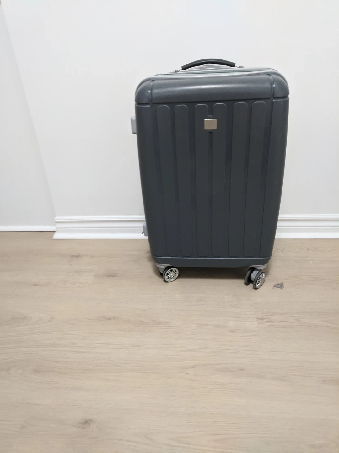 This is a dark grey hardside spinner luggage. It has a retractable handle and four spinner wheels for easy manoeuvring. The exterior is made of a durable material. Pick up at 195 Merton Street Toronto or pick up at Subway station Davisivill. And I can deliver it to your house but you need to pay me another $3. Thanks.
