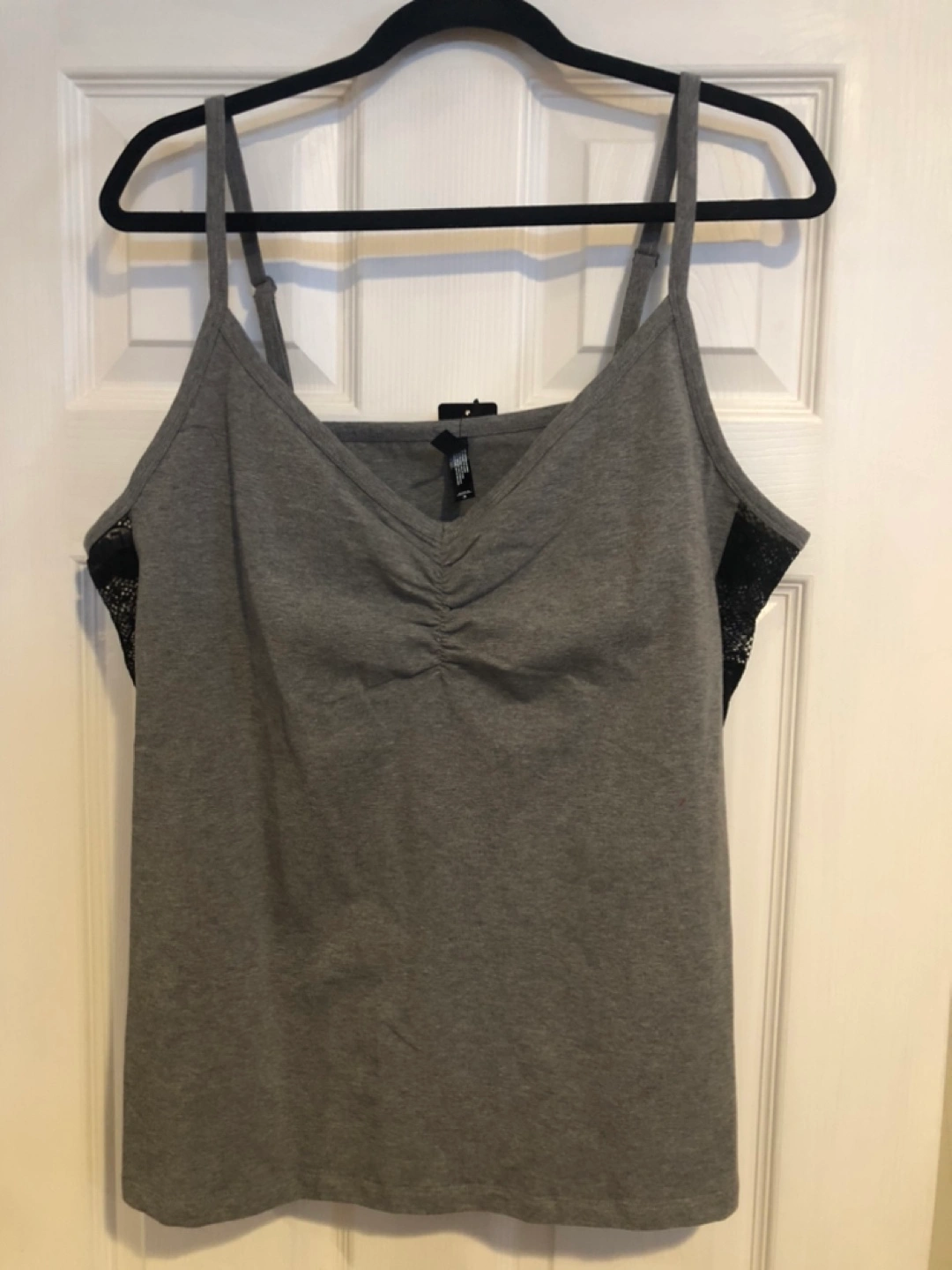 New grey sleeveless sleep tank with black lace detailing. Size 3. Features a V-neck and gathered front. Side lace panels.