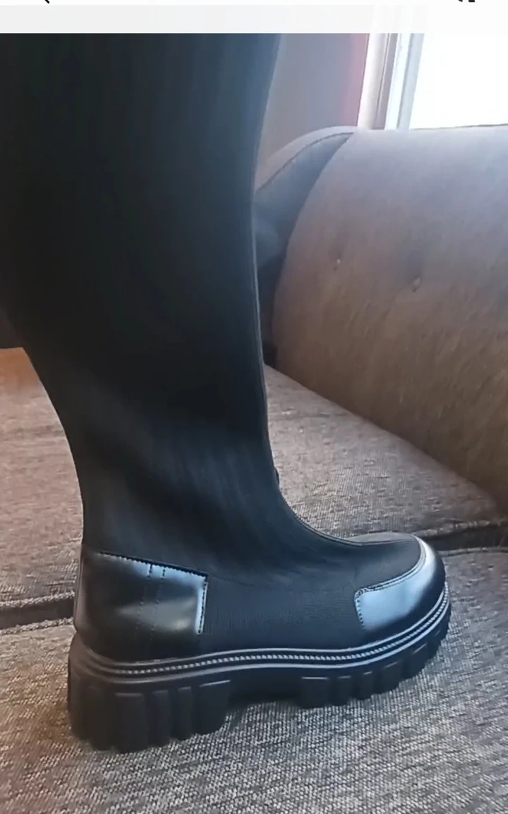 These black sock boots feature a comfortable, stretchy shaft and a sleek faux leather toe cap. They have a substantial lug sole that provides excellent traction. The shaft is made of a ribbed knit material for a snug fit.