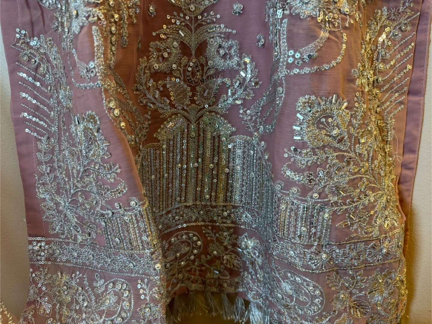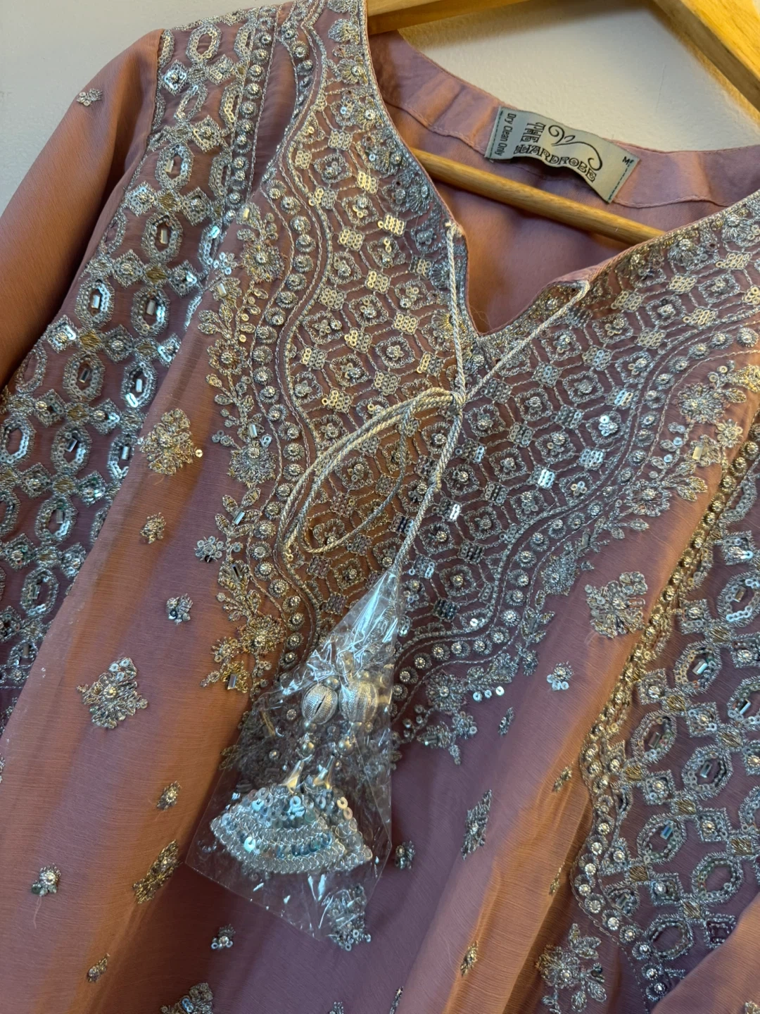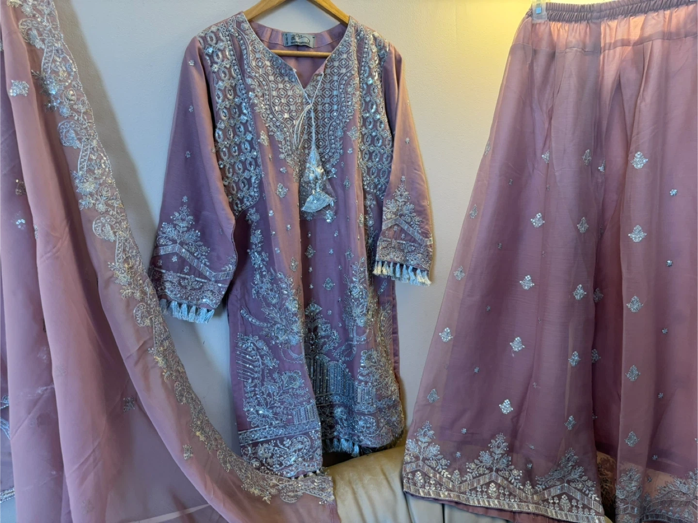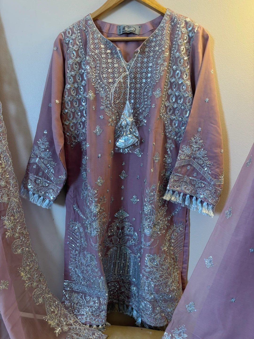 This is a Riazarhams kurti and dupatta set with intricate silver embroidery and sequin work. The fabric is a soft mauve colour. Perfect for formal events or festive occasions!