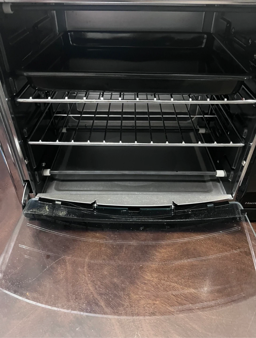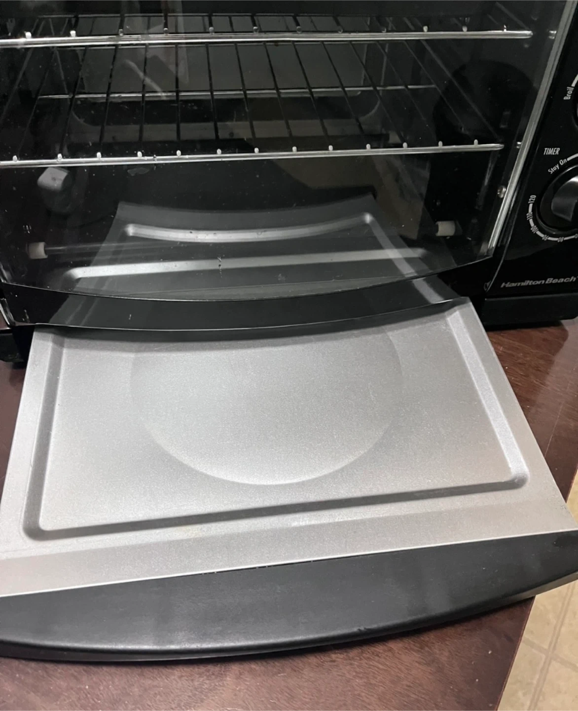 Black Hamilton Beach Countertop Convection Toaster Oven. Features convection, bake, broil and rotisserie functions. Large capacity. Includes a baking pan, 2 wire racks, and a removable crumb tray. Adjustable cooking timer and temperature controls, as well as a stay-on setting with auto shutoff. Easy to clean. This convection toaster oven gives you all the counter cooking convenience you love in a toaster oven. In addition to traditional toasting, baking, and broiling, convection cooking lets you cook great tasting evenly cooked foods in the oven. Excellent condition, like new. Used only once. From smoke-free, pest-free, and pet-free home.