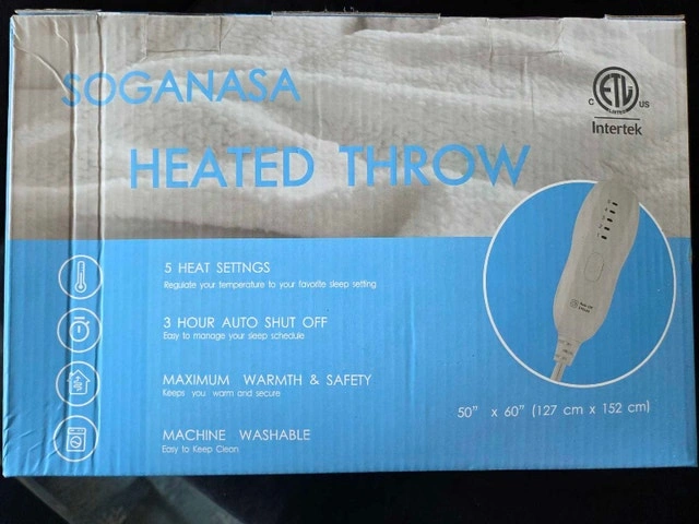 Stay warm and relaxed with this ultra-soft heated throw blanket. Features 5 heat settings, 3-hour auto shut-off, and machine washable fabric for easy care. ETL certified for safety. Perfect for chilly nights, cozy naps, or gifting season. Size: 50"x60". Brand new in box! Pickup ONLY near Don Mills and Eglinton intersection. PRICE IS FINAL.