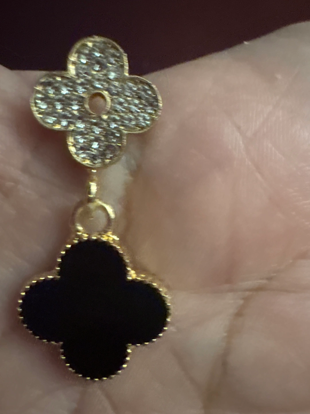 Stunning black and 18K gold plated clover earrings. Gold metal with black enamel accents. Rhinestone detailing. Post backings. New, comes with Box and cleaning cloth