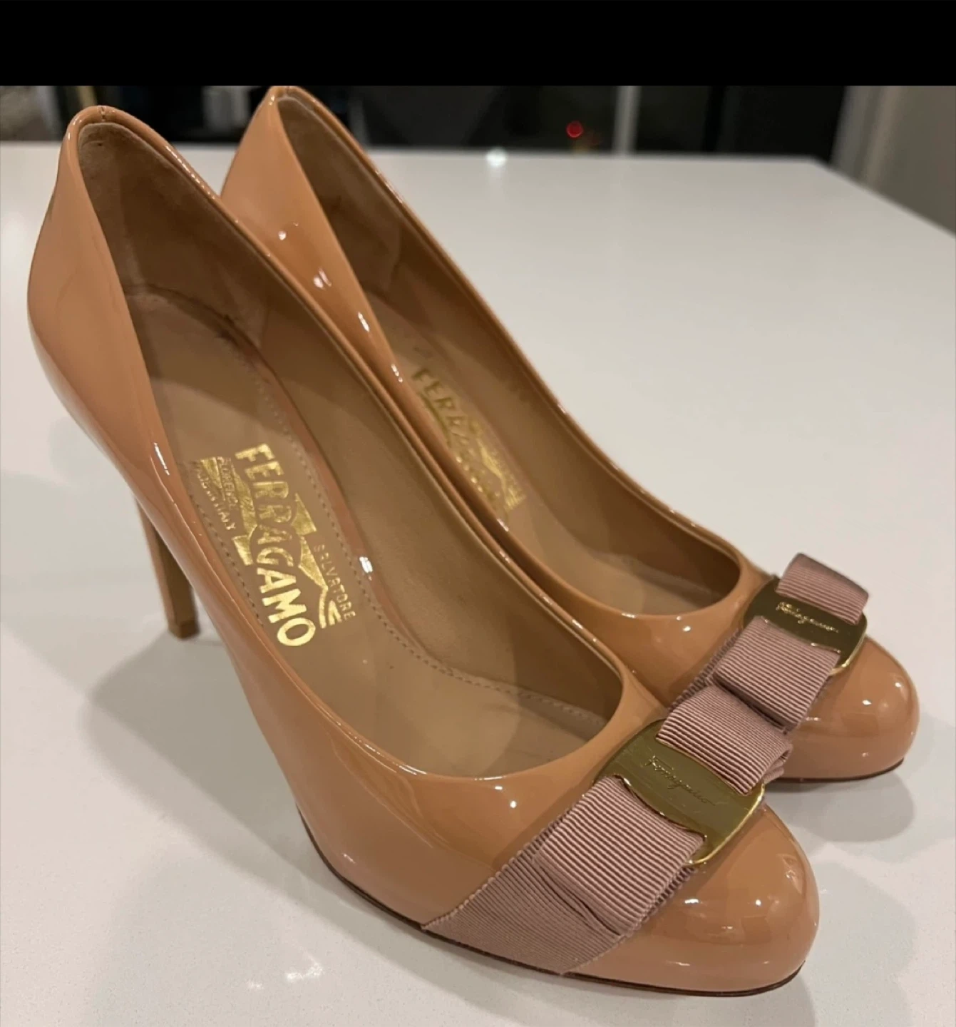 Salvatore Ferragamo patent leather heels with a signature bow detail. Made in Italy. Size 6.5B.