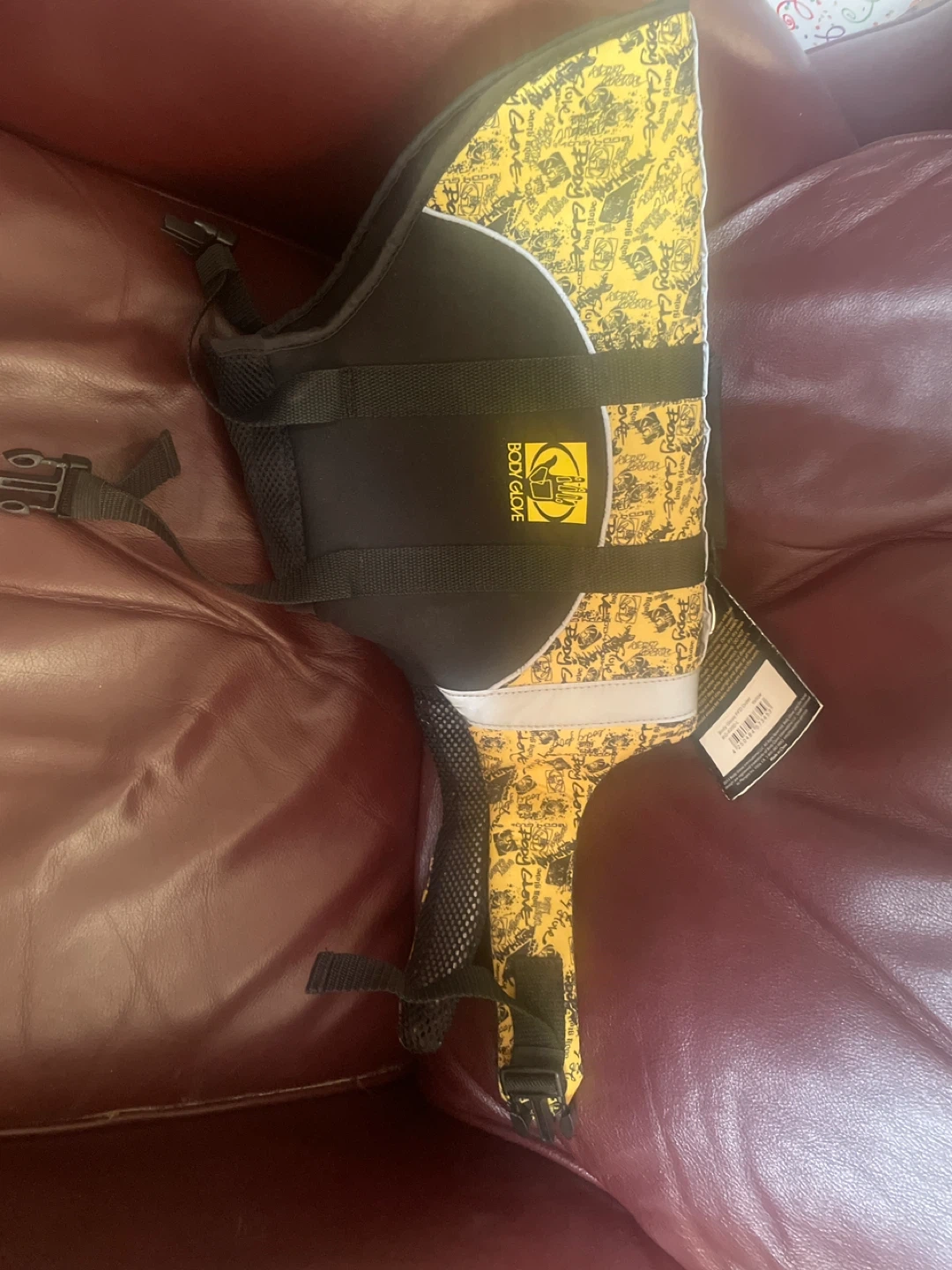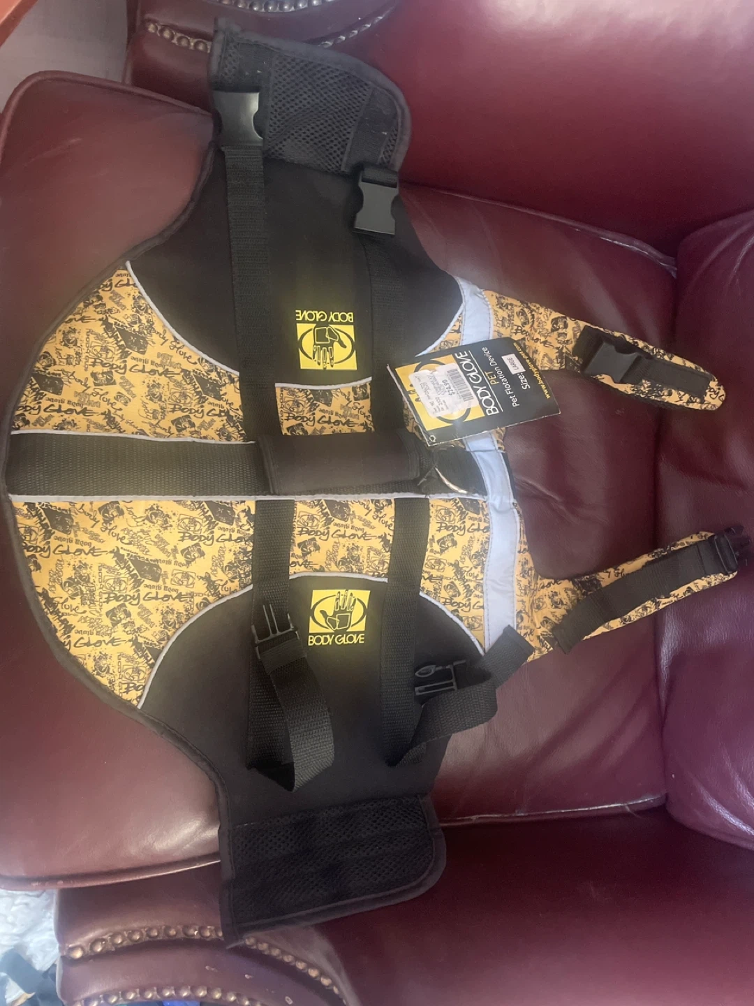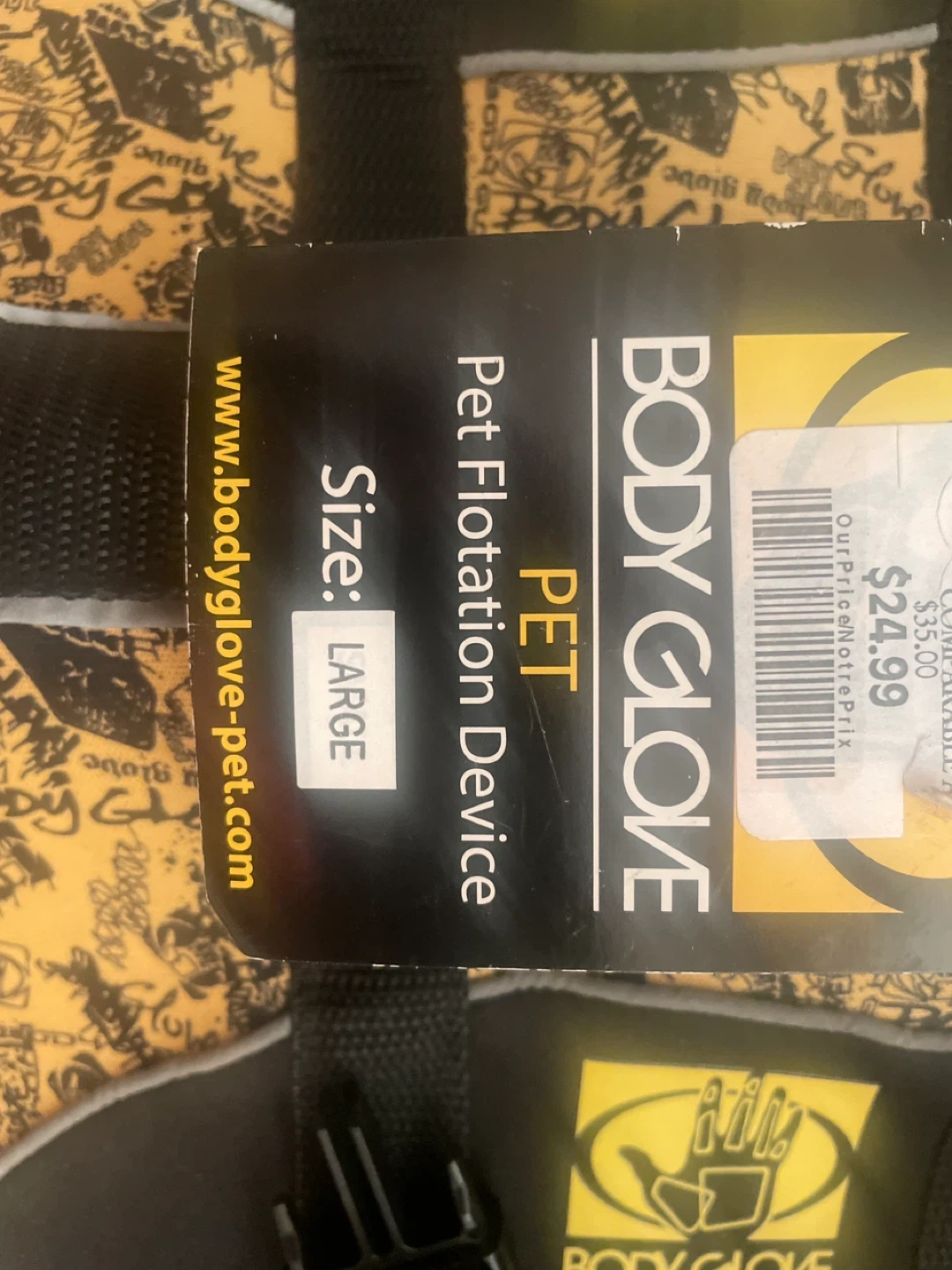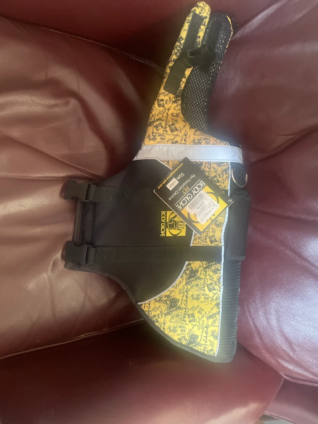 This is a Body Glove Pet Flotation Device. It's designed for your pet's safety during water activities. Features adjustable straps for a secure fit and a handle for easy retrieval. It's a large size.