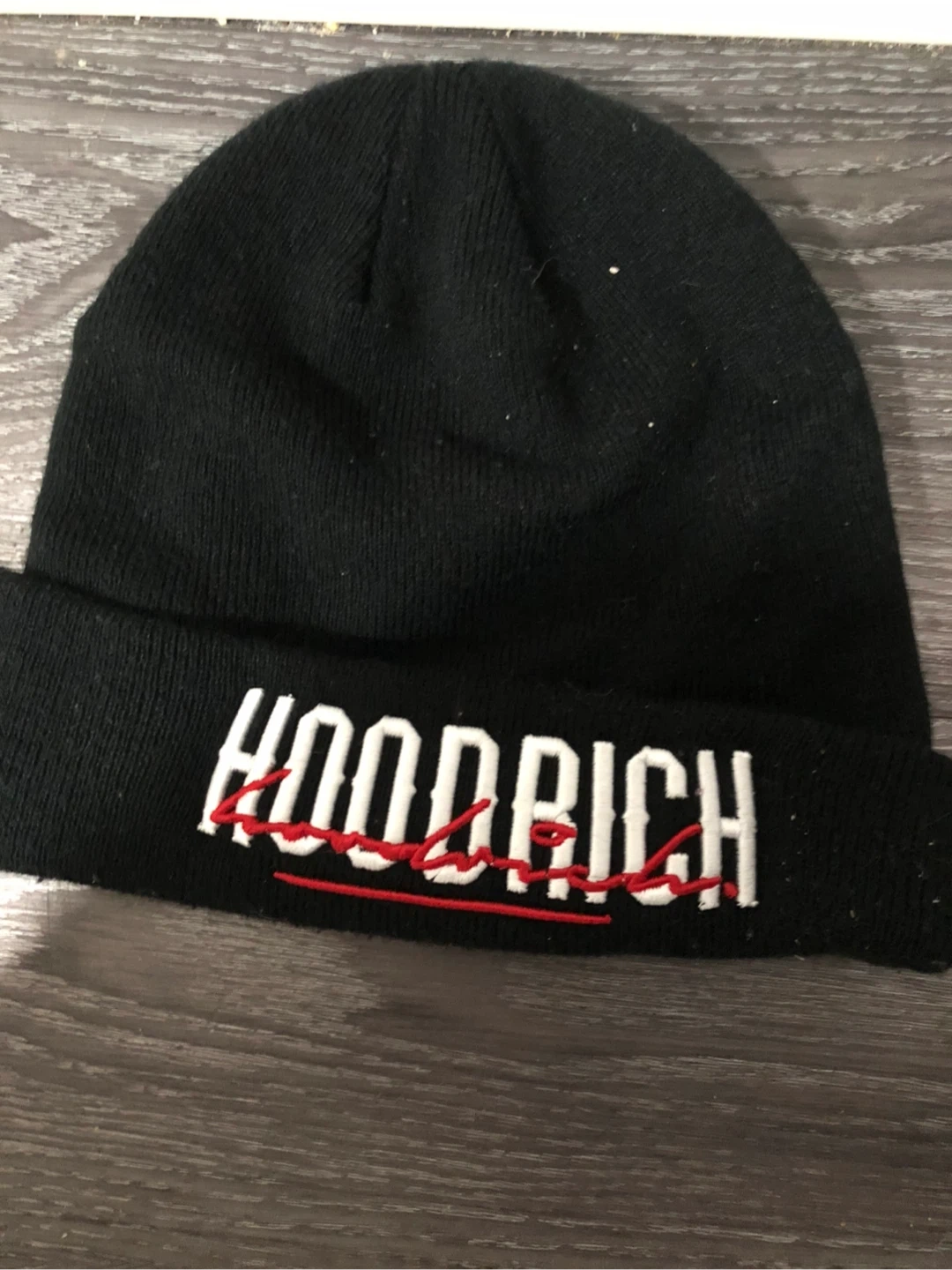 This is a black HOODRICH beanie. It's made of 100% acrylic. Hand wash only and reshape while damp. Lay flat to dry.