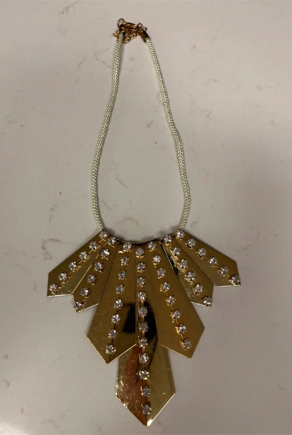 A statement necklace featuring a gold-tone fan design adorned with clear rhinestones. It has a braided white cord and a gold-tone chain clasp. This piece adds a touch of sparkle to any outfit!